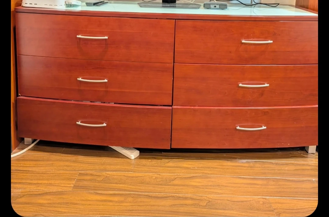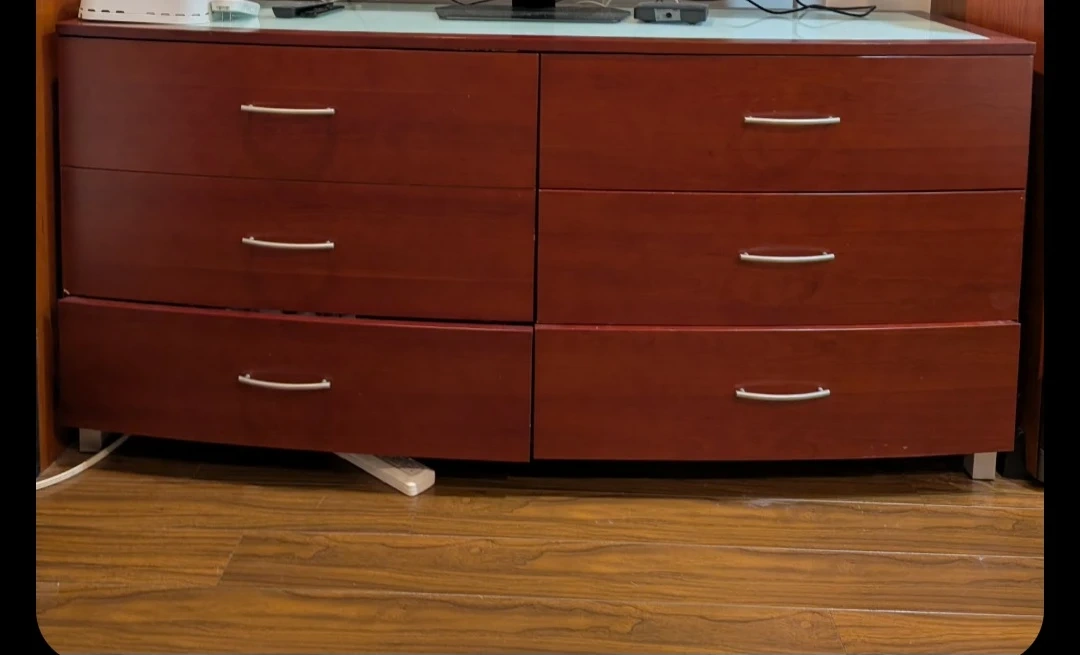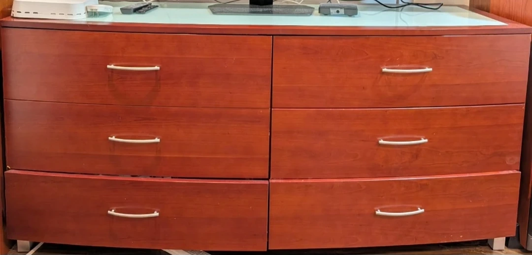 Here's a wood dresser with six drawers! It's perfect for adding storage to any bedroom or living space. Please note that the bottom left drawer has a crack.