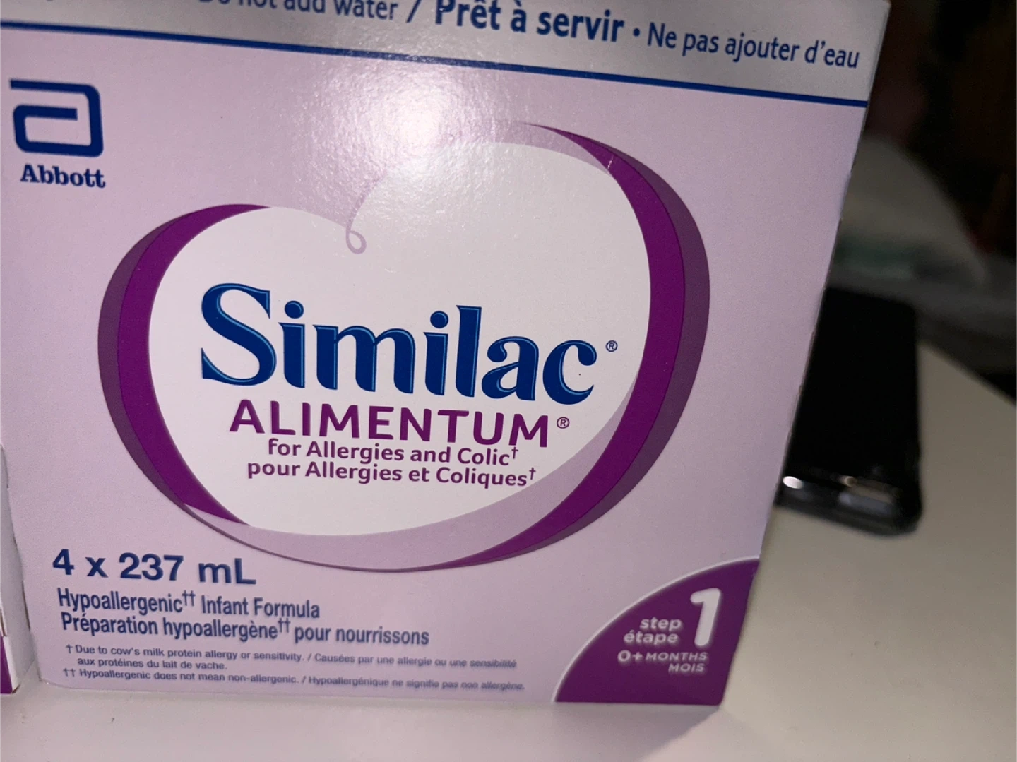 Selling Similac Alimentum infant formula. It is hypoallergenic and for allergies and colic. Each box contains 4 x 237 mL bottles. Suitable for babies 0+ months