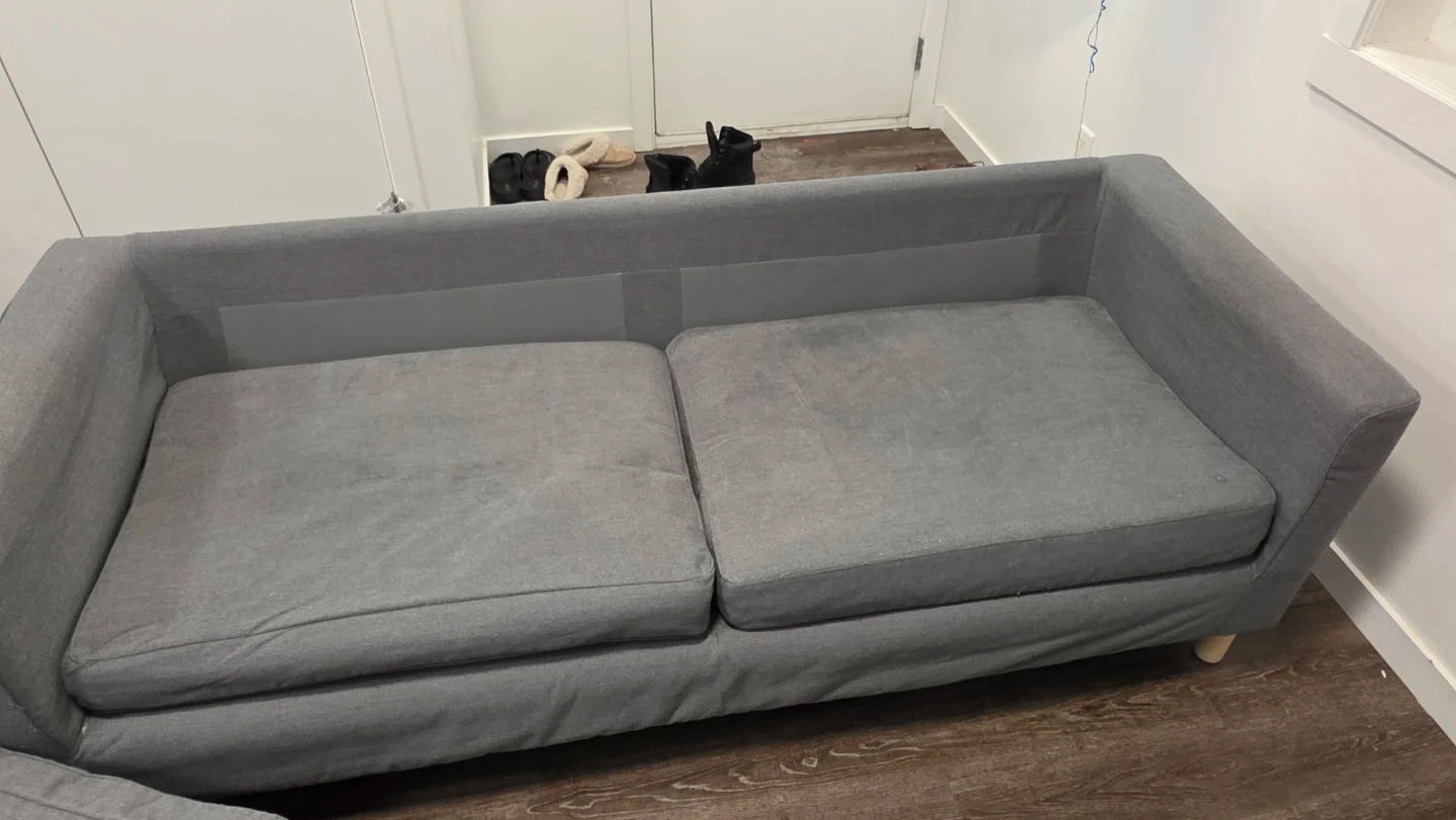 Selling a comfy grey two-seater sofa! It's perfect for a small space or apartment. It has a classic design and is in good condition for everyday use. Please take a look at the pictures for details!