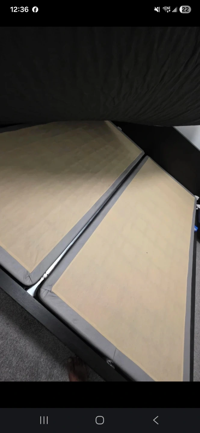 Selling a king size mattress and bed frame. The mattress has some visible signs of use. The bed frame is a dark colour and in good condition. Disambeled