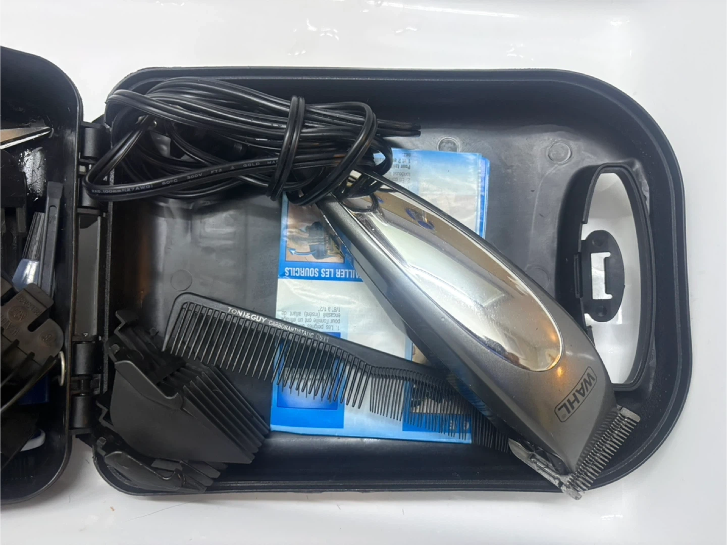 Selling a Wahl hair clipper set, complete with a variety of attachments, scissors, and combs. It all comes neatly organized in a handy carrying case, making it easy to store and transport. Great for at-home haircuts!