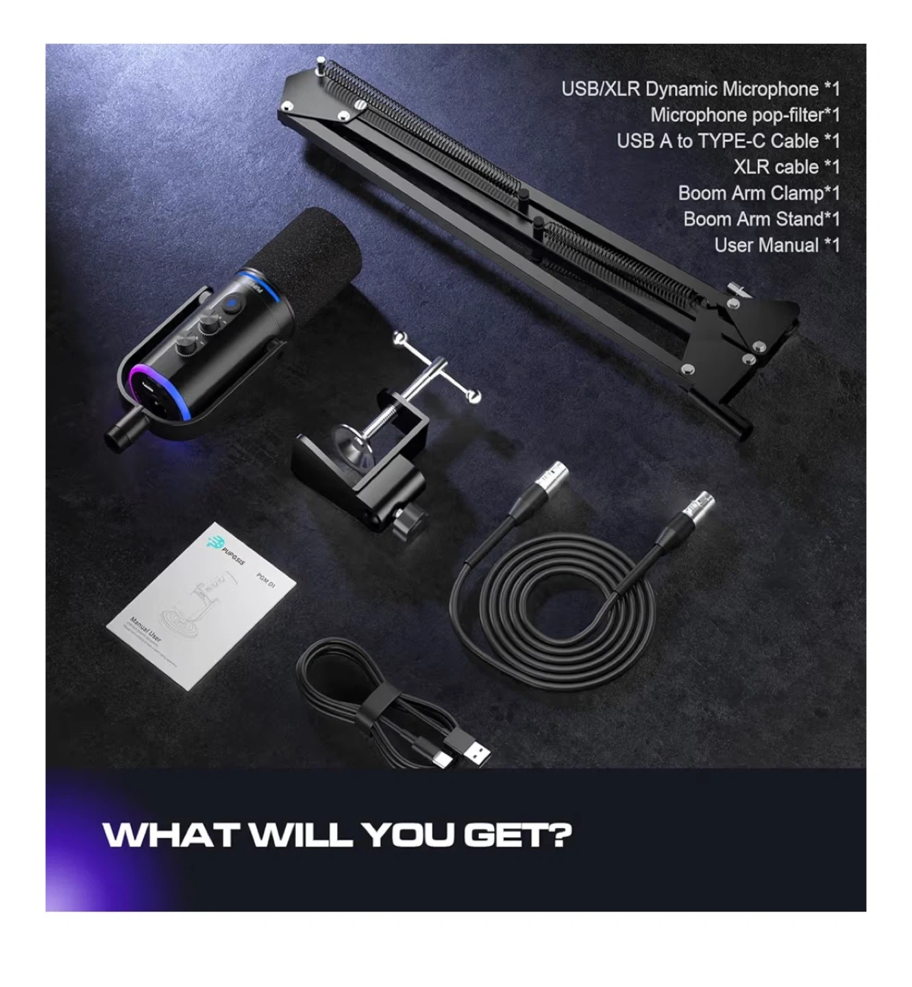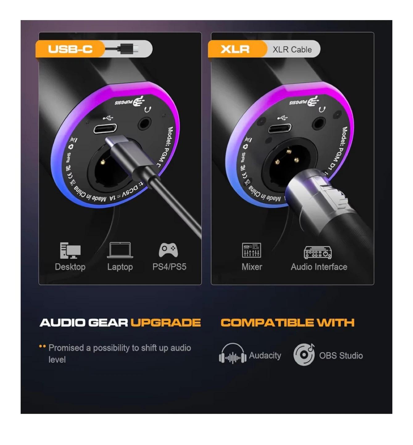 Selling a PUGPSIS PGM D1 microphone. It comes with a reliable and flexible arm stand that fits on max 2" thickness. It also includes both USB-C and XLR cables, making it compatible with a variety of devices such as desktops, laptops, PS4/PS5, mixers, and audio interfaces. Promised a possibility to shift up audio level. This microphone features 7 RGB lighting modes to create your live streaming atmosphere