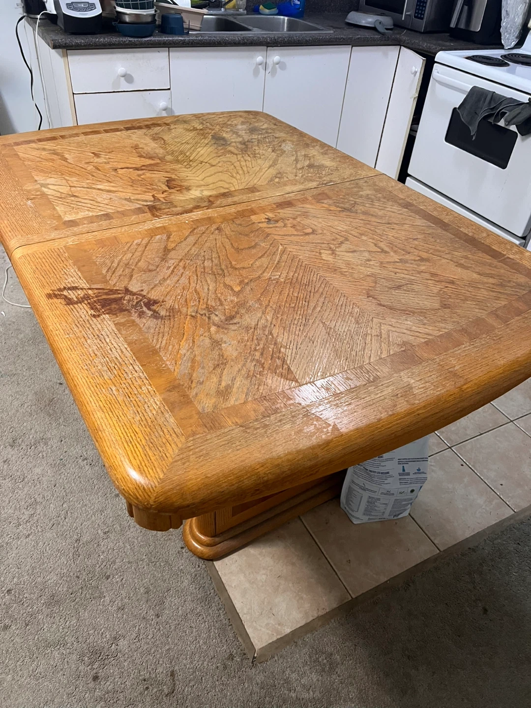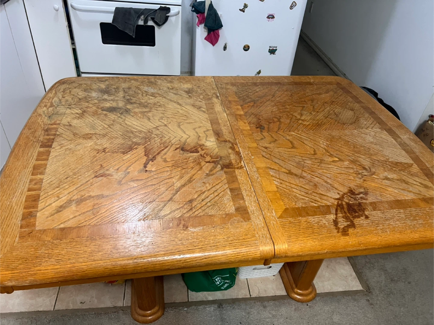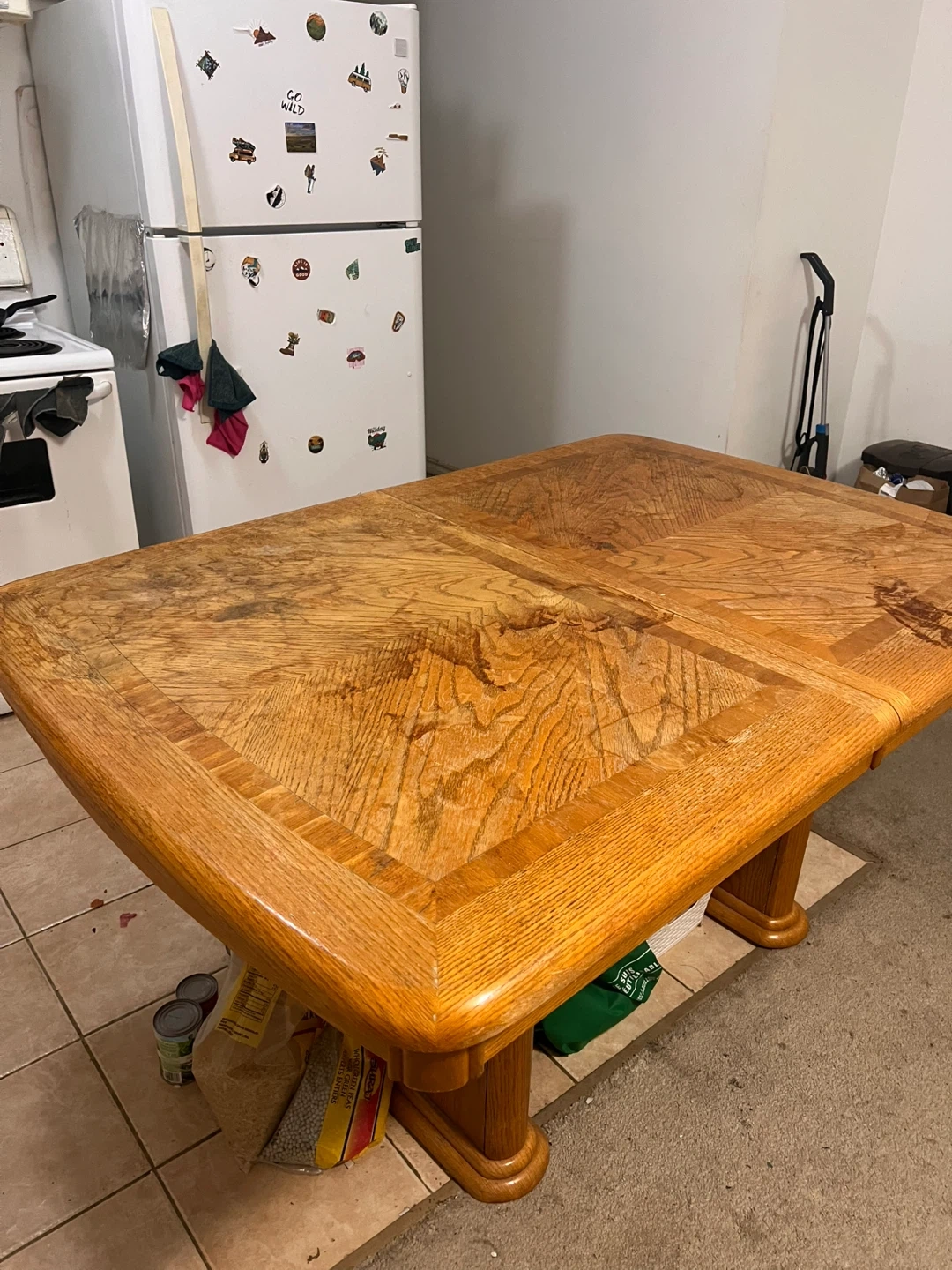 Selling a wooden dining table. It has a unique wood grain pattern on the surface. It has some wear and tear, but is still sturdy and functional.
