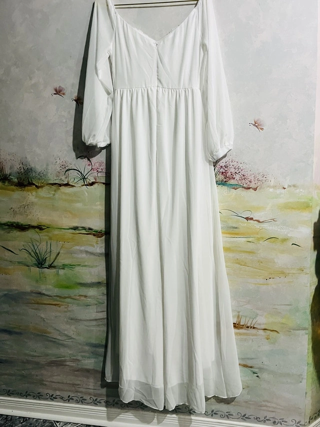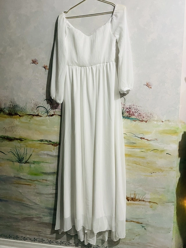 This is a brand new beautiful, flowing white dress, perfect for a special occasion or a stylish everyday look. It has long sleeves, and a flattering silhouette. Don't miss out on this lovely dress! pick up is in Brampton near Sheridan College