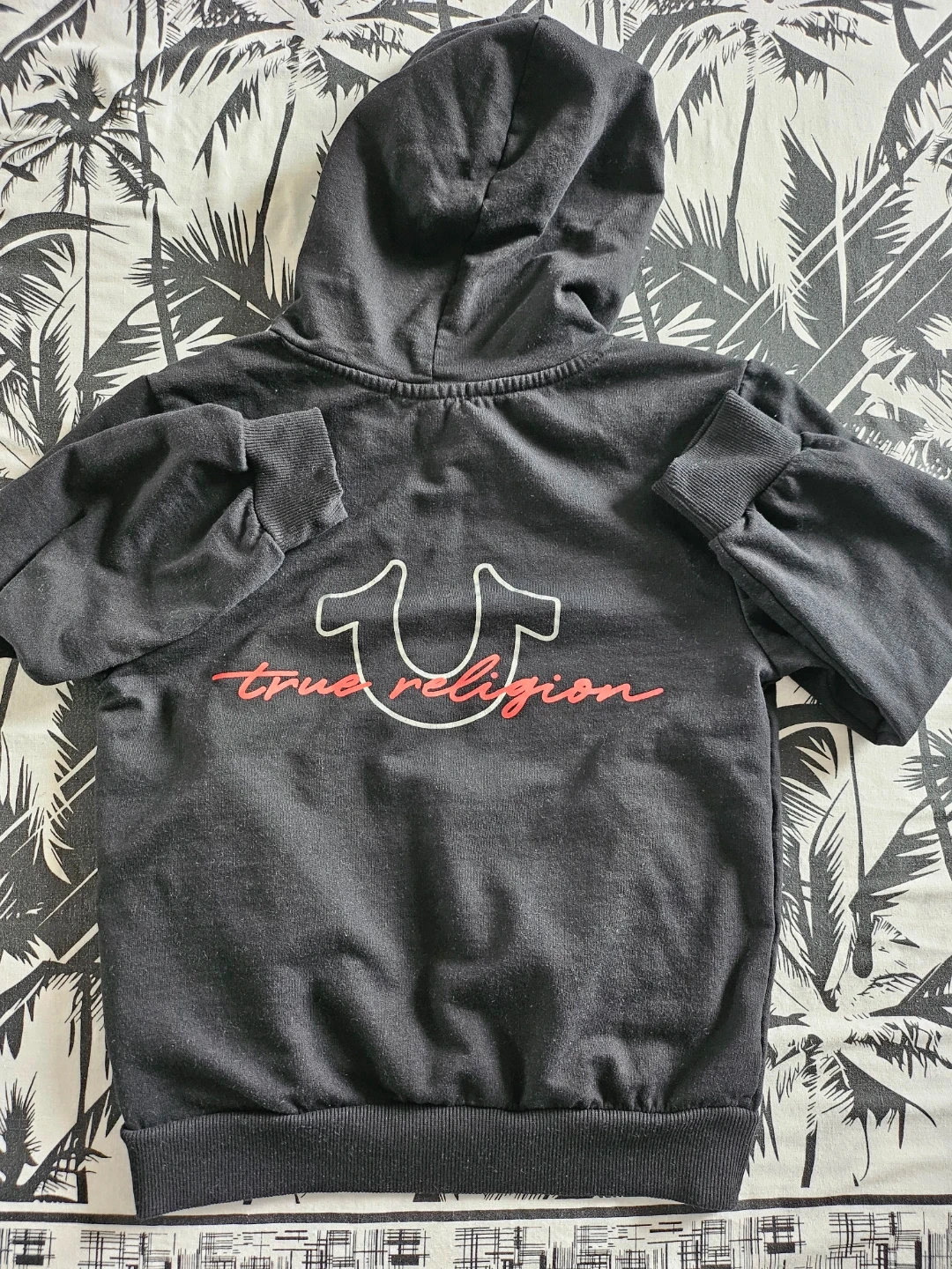 True Religion hoodie in black. Features the iconic True Religion logo on the front and back. Perfect for layering or wearing on its own!