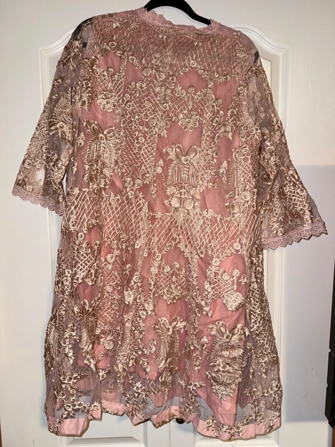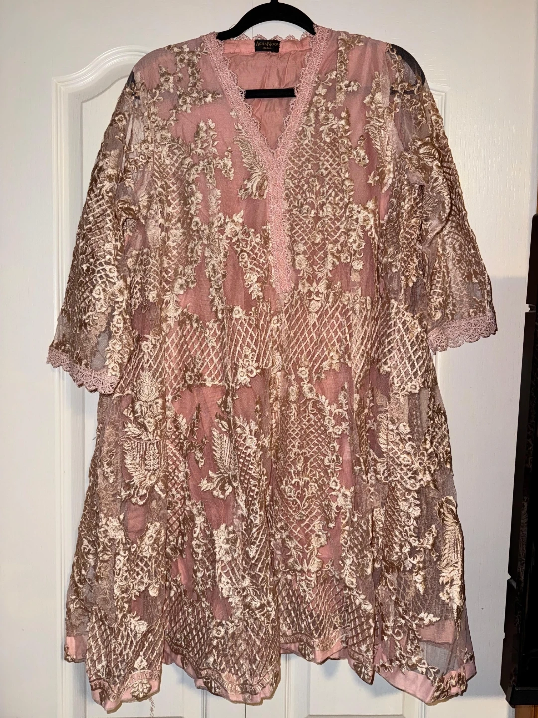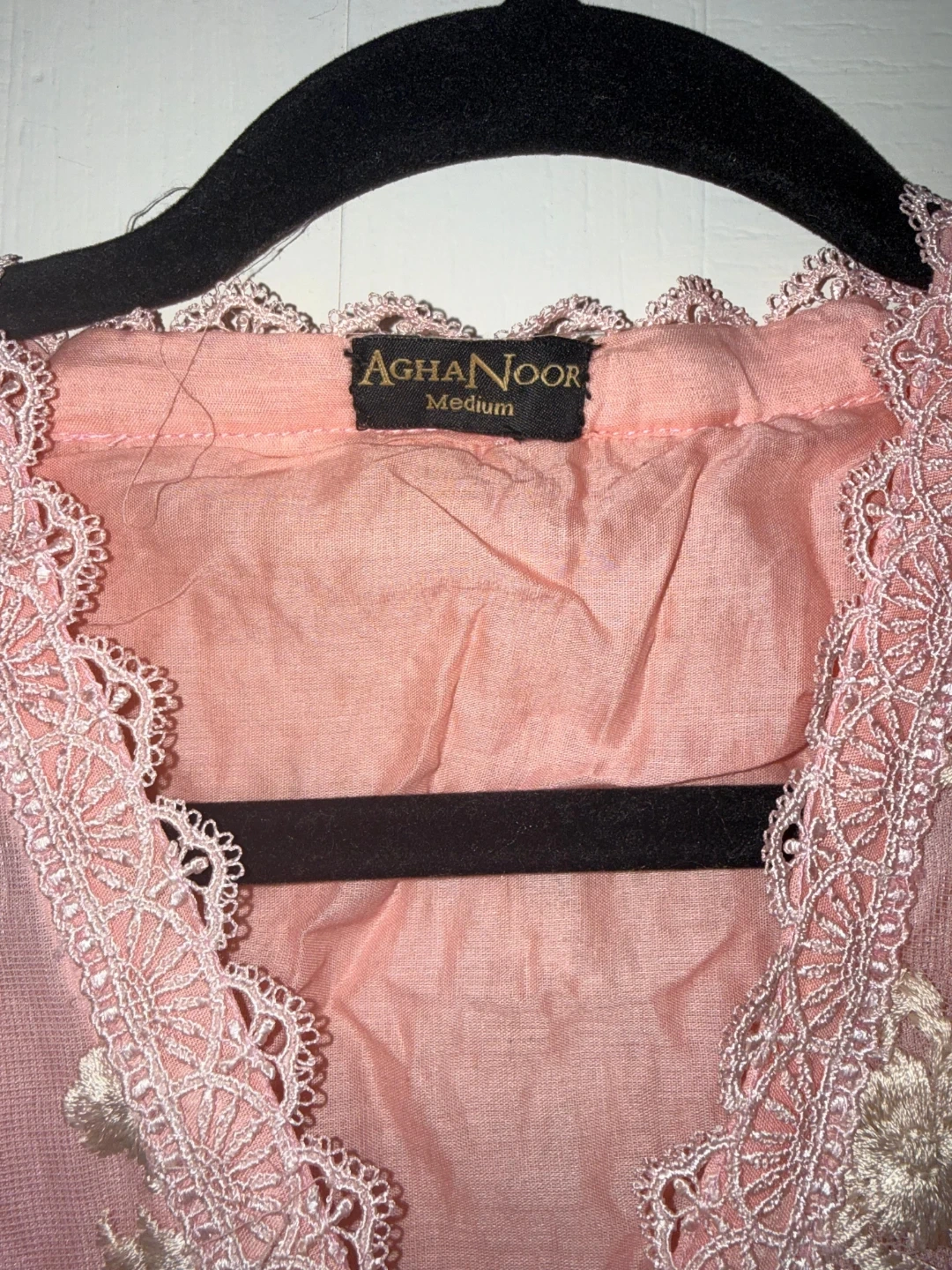 Selling a lovely Agha Noor dress in size large It features beautiful lace detailing and a soft pink colour. Perfect for a special occasion or a night out