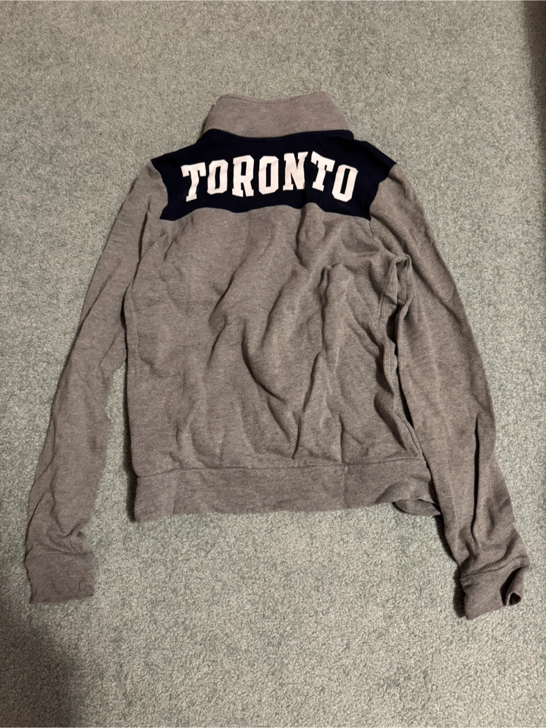 Cozy Toronto quarter-zip sweatshirt from VS Pink. The sweatshirt is a stylish grey with navy blue accents and features the iconic Toronto logo.