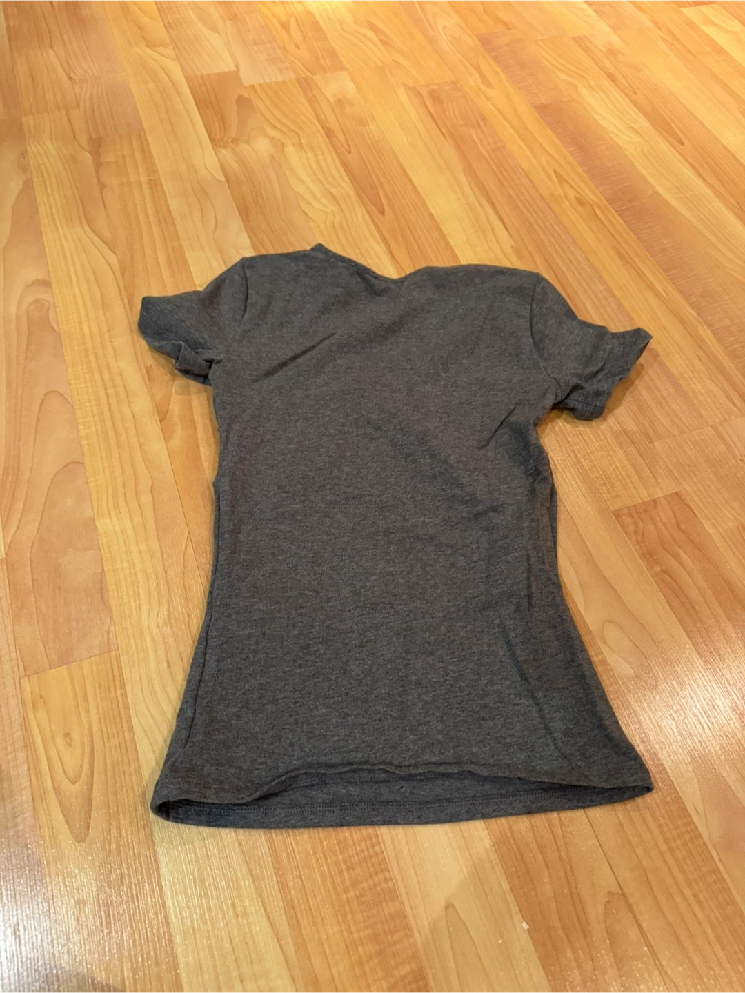 A simple and stylish gray wrap t-shirt, perfect for casual wear. It's a size XS from Garage and in great condition! The wrap design adds a nice touch to a basic tee.