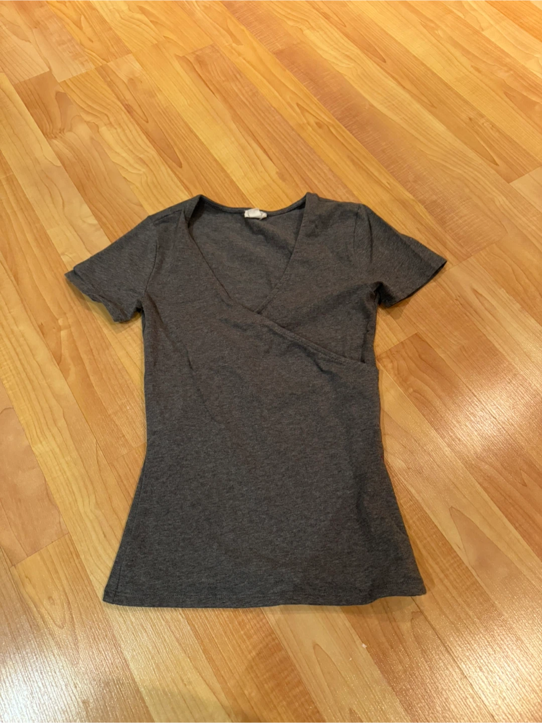 A simple and stylish gray wrap t-shirt, perfect for casual wear. It's a size XS from Garage and in great condition! The wrap design adds a nice touch to a basic tee.