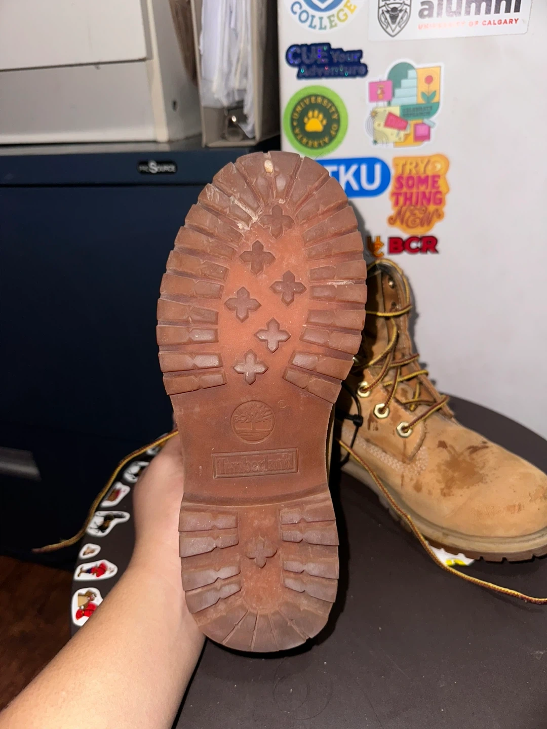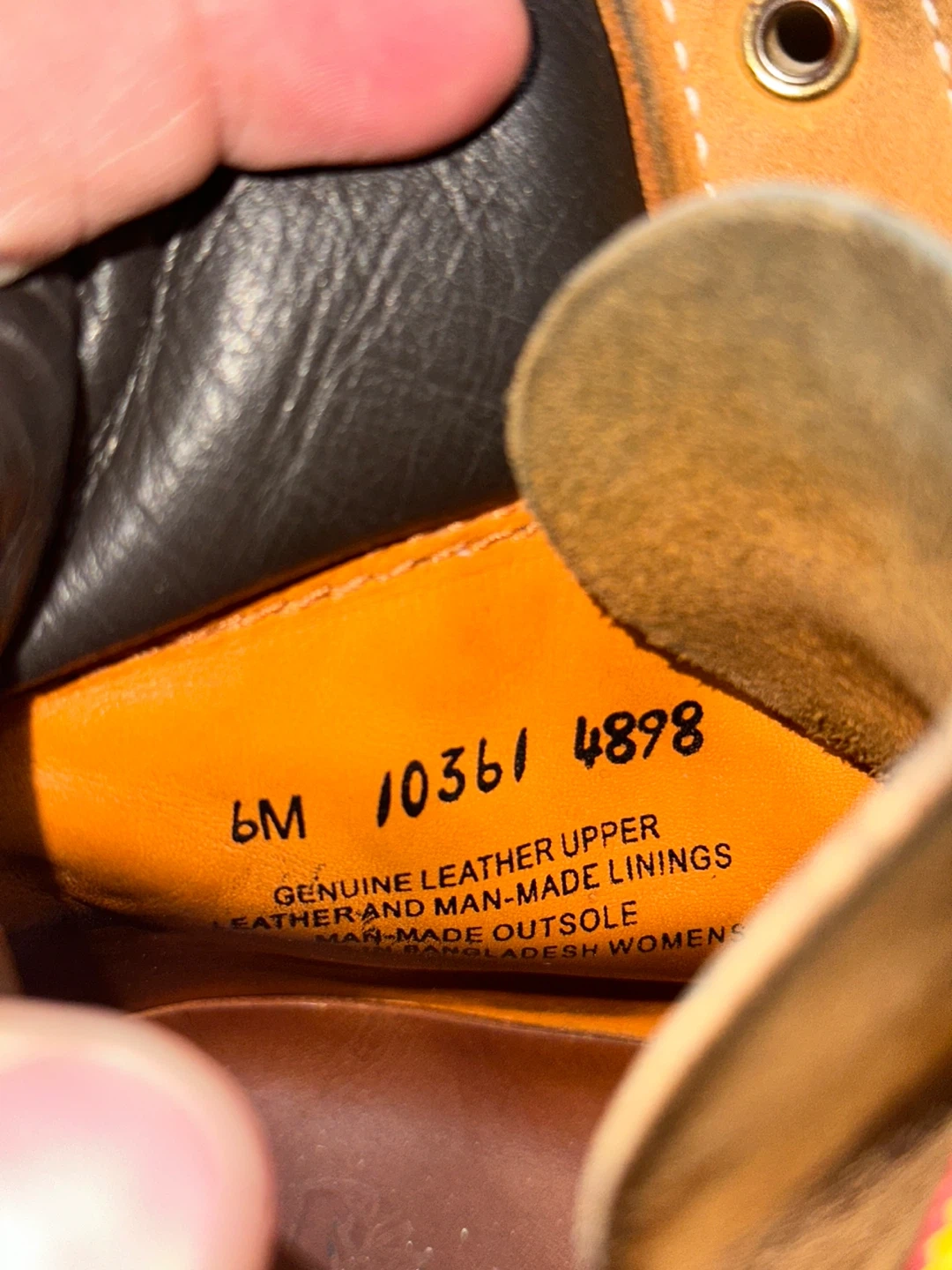 Selling a pair of Timberland boots in size 6. They have a genuine leather upper and man-made linings. The outsole is also man-made. They are in used condition, as you can see in the pictures!