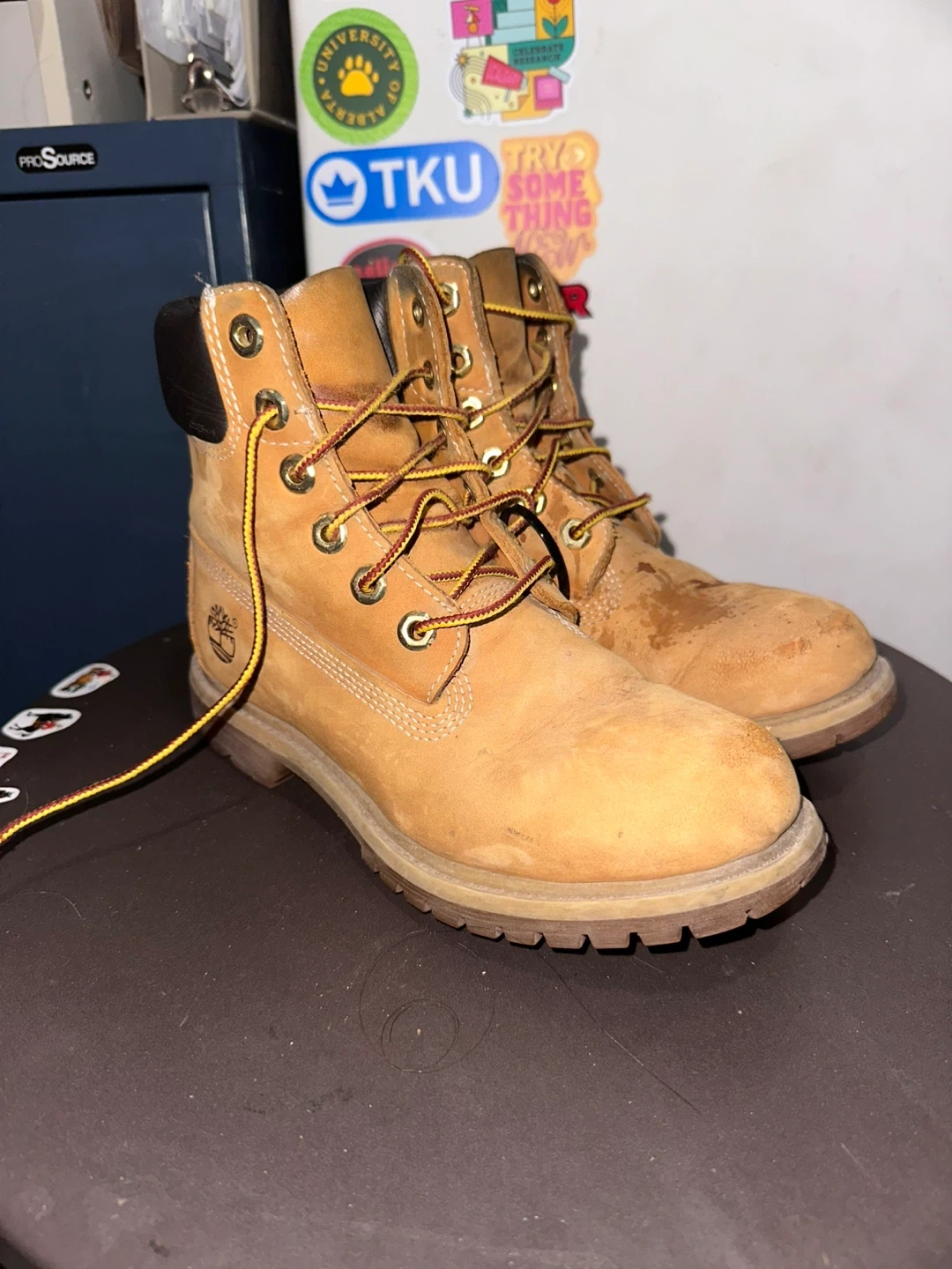 Selling a pair of Timberland boots in size 6. They have a genuine leather upper and man-made linings. The outsole is also man-made. They are in used condition, as you can see in the pictures!