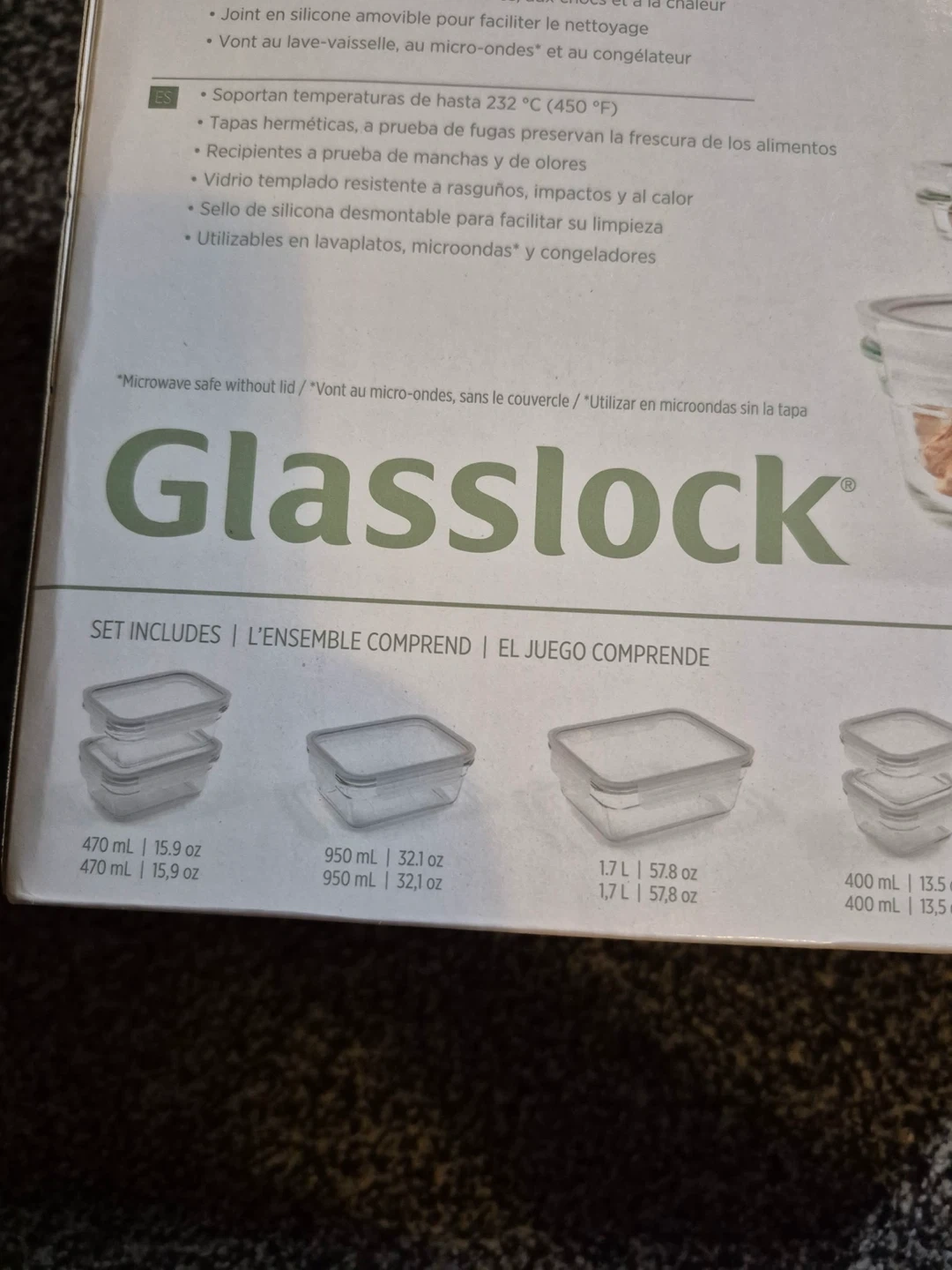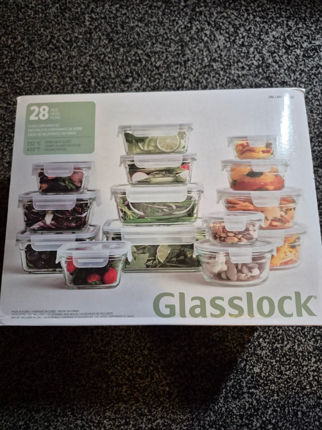 Selling a brand new Glasslock 28-piece glass container set! These containers are oven safe up to 232°C (450°F). The box includes an ensemble of glass containers, perfect for storing leftovers or meals! Never taken out of the box! Worth 50 dollars on Costco!
