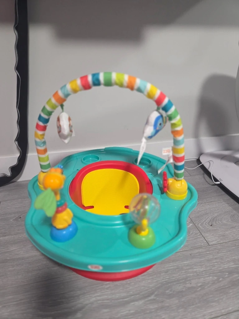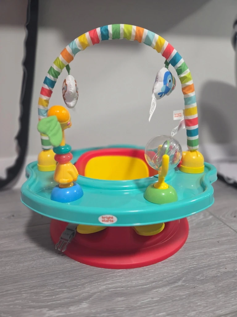 Selling a gently new Bright Starts Around We Go! Activity Station. It's in great condition and ready for a new little one to enjoy. This activity station provides a fun and engaging way for babies to explore and develop their motor skills. It features a variety of toys and activities to keep your baby entertained!