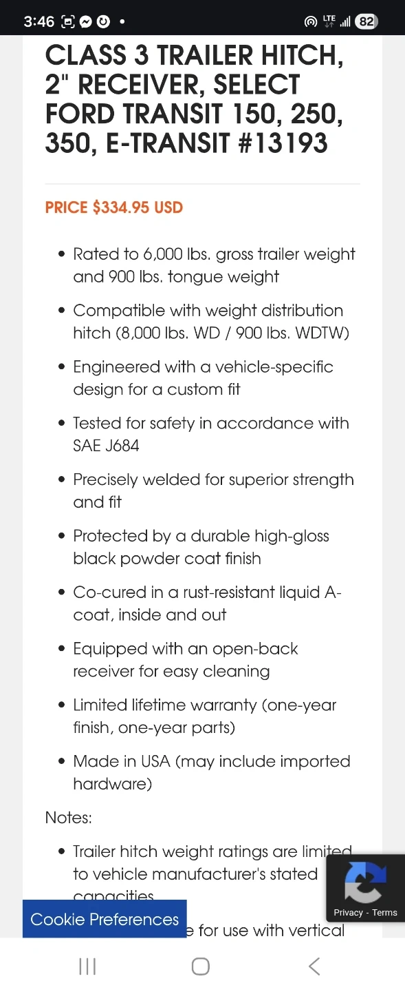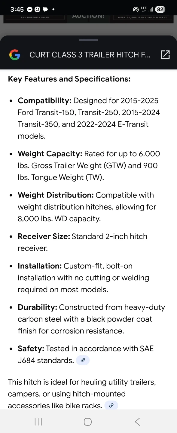 I'm selling a Curt Class 3 Trailer Hitch designed for Ford Transit 150, 250, 350, and E-Transit models from 2015-2025. This used hitch features a 2" receiver and is rated for up to 6,000 lbs gross trailer weight and 900 lbs tongue weight. It's also compatible with weight distribution hitches, allowing for 8,000 lbs WD capacity.