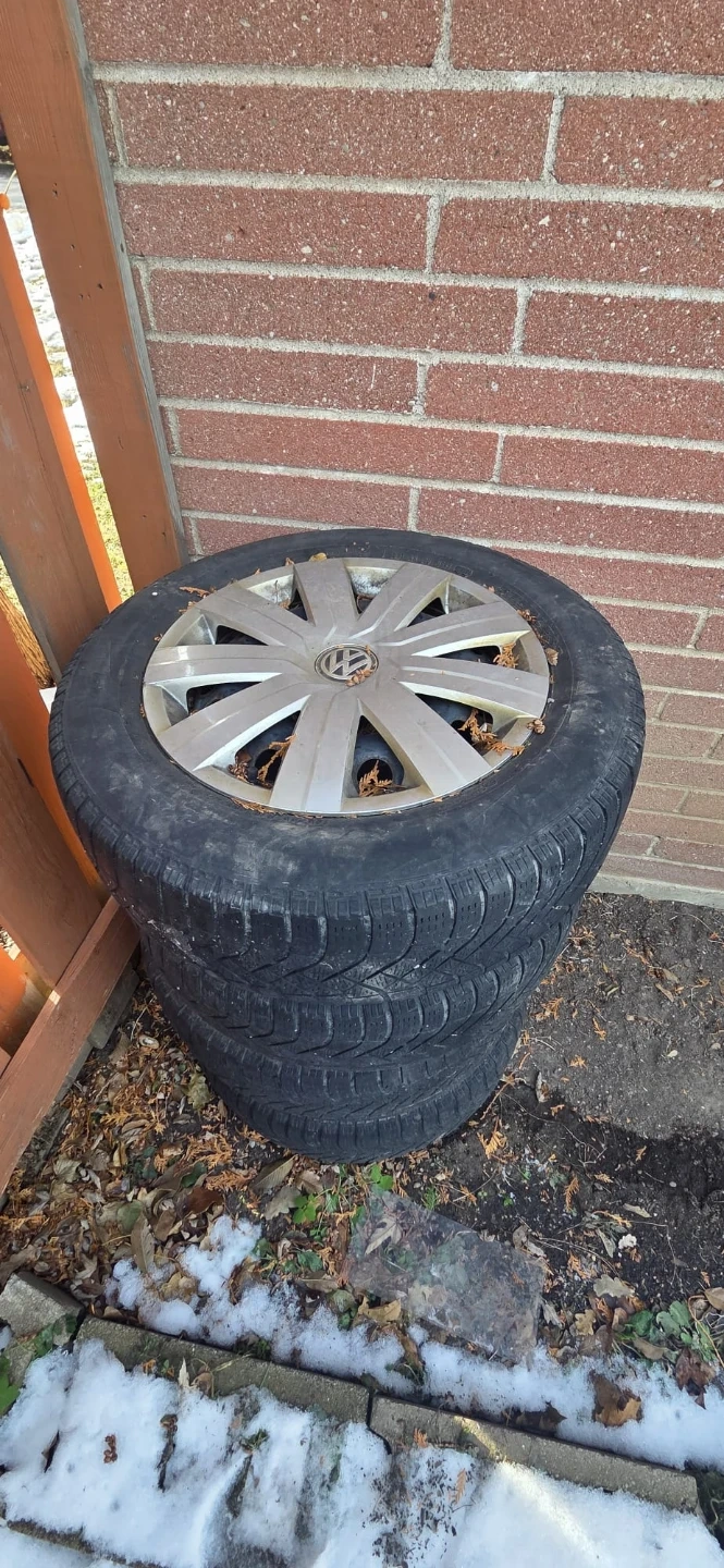 Selling a set of Volkswagen tires, complete with hubcaps. They've been used, but are still in decent shape. Perfect if you need a spare set or replacements!
