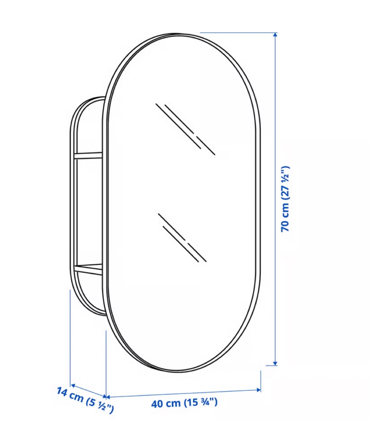 Selling an Ikea oval mirror with a shelf! It's in great condition and ready to add a touch of style to your space. The mirror measures 70 cm (27 ½") in height and 40 cm (15 ¾") in width, with a depth of 14 cm (5 ½")