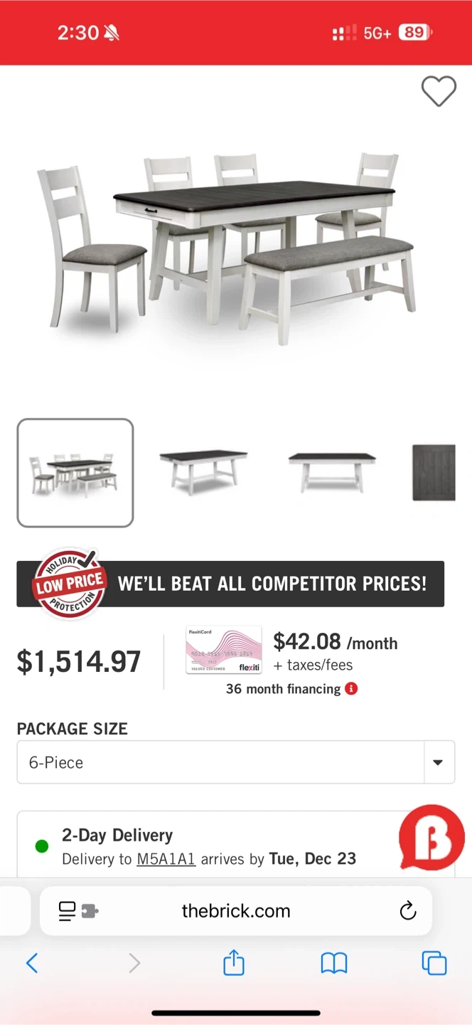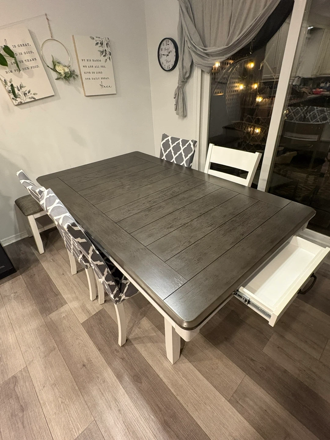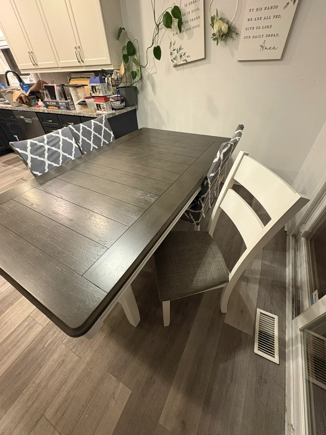 Selling a lovely dining table set that includes four chairs and a matching bench. The table has a beautiful wood-grain top with a sturdy base. The chairs are upholstered with a stylish grey and white pattern, and the bench is a neutral brown fabric. This set would be perfect for family dinners or entertaining guests!