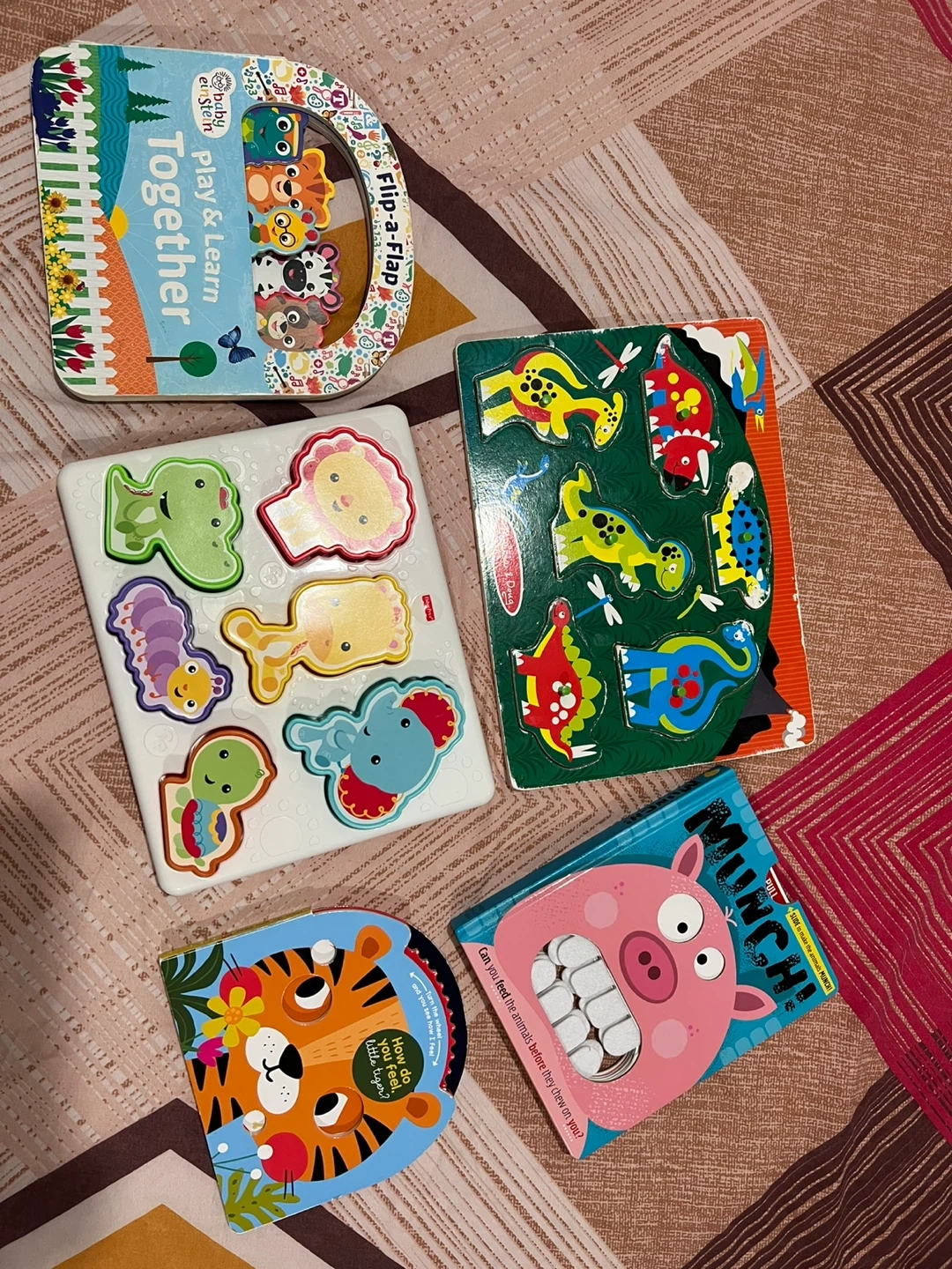 A collection of gently used kids' books and puzzles! Includes a Baby Einstein 'Play & Learn Together' flip-a-flap book, a 'Munch!' book, a tiger feelings book, a wooden animal puzzle, and a white animal puzzle