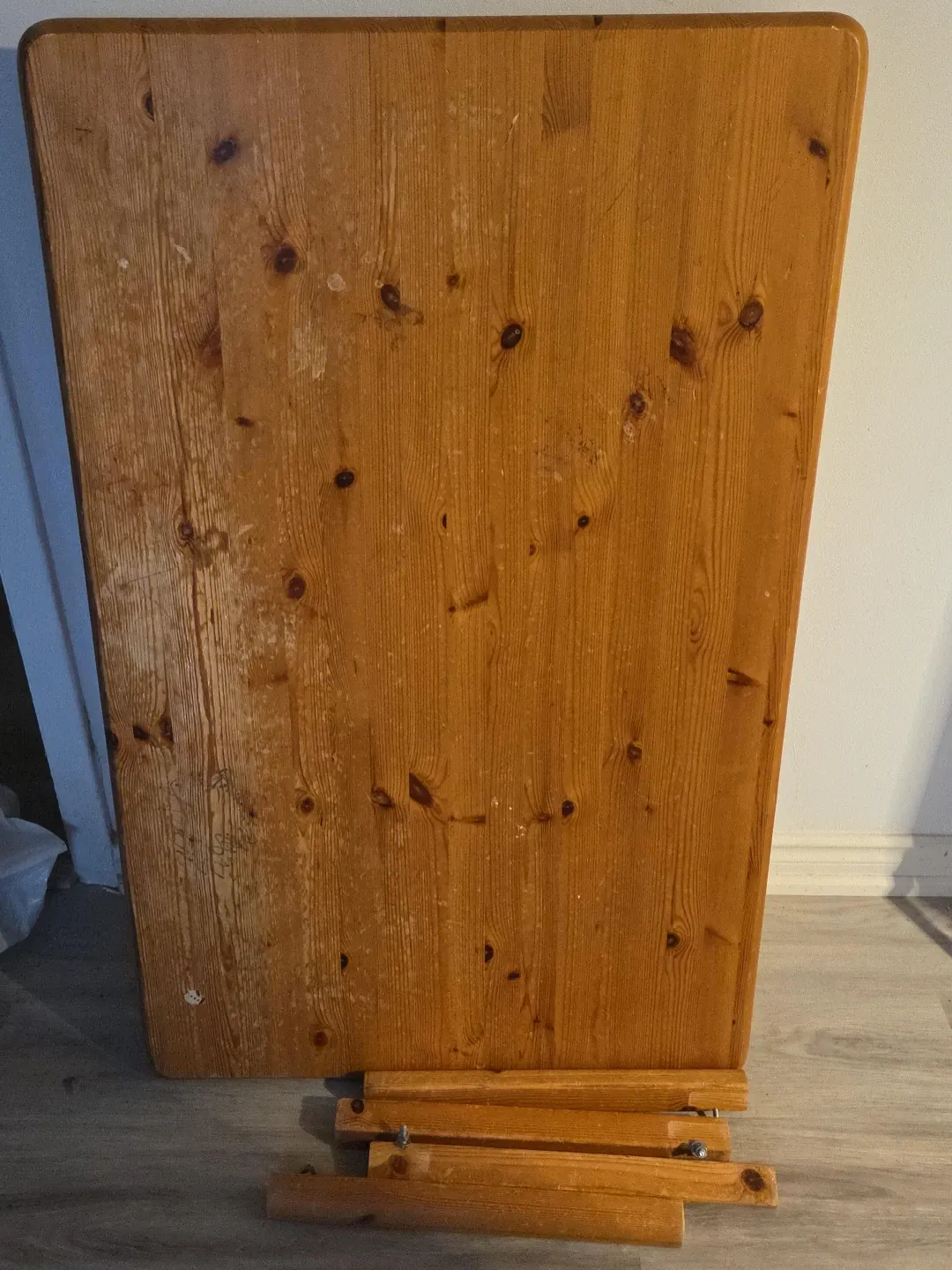 Selling a wooden table top with the legs. It's in good condition and ready for a new home! Perfect for a DIY project or to replace an old table top. Please take a look at the photos to see the condition