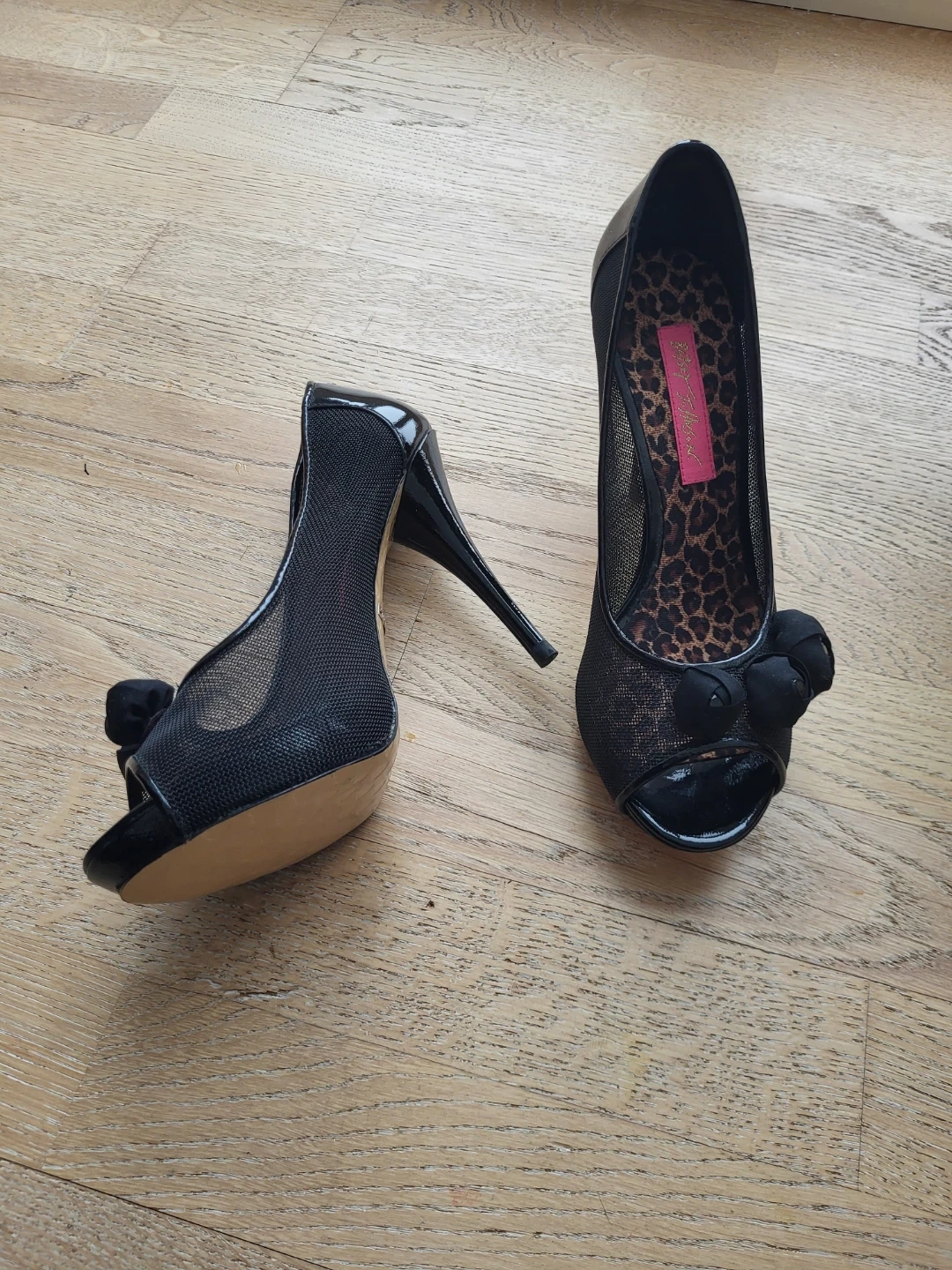 Selling a brand new pair of Betsey Johnson black heels. They feature a mesh design and a cute bow detail on the front. The inside has a fun leopard print!