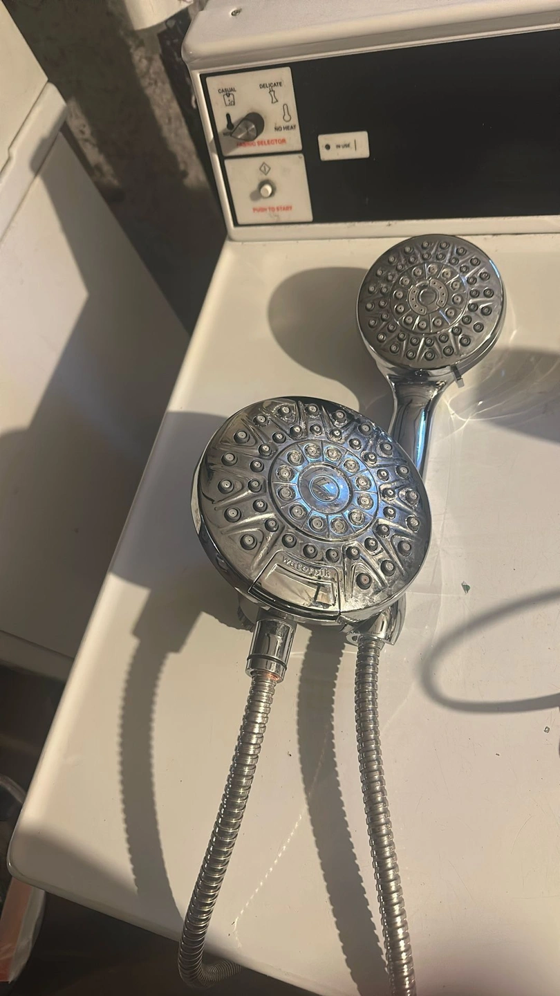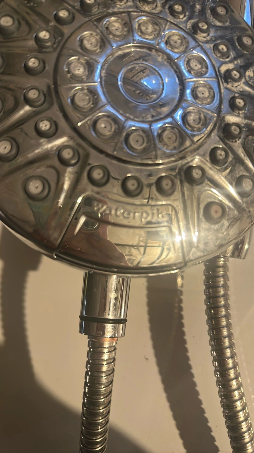 Amazing water pick shower head full blast power that you can change, has two shower head one pulls down to get entire and or desired body areas only had it a couple months before using. Perfect condition and no rust.