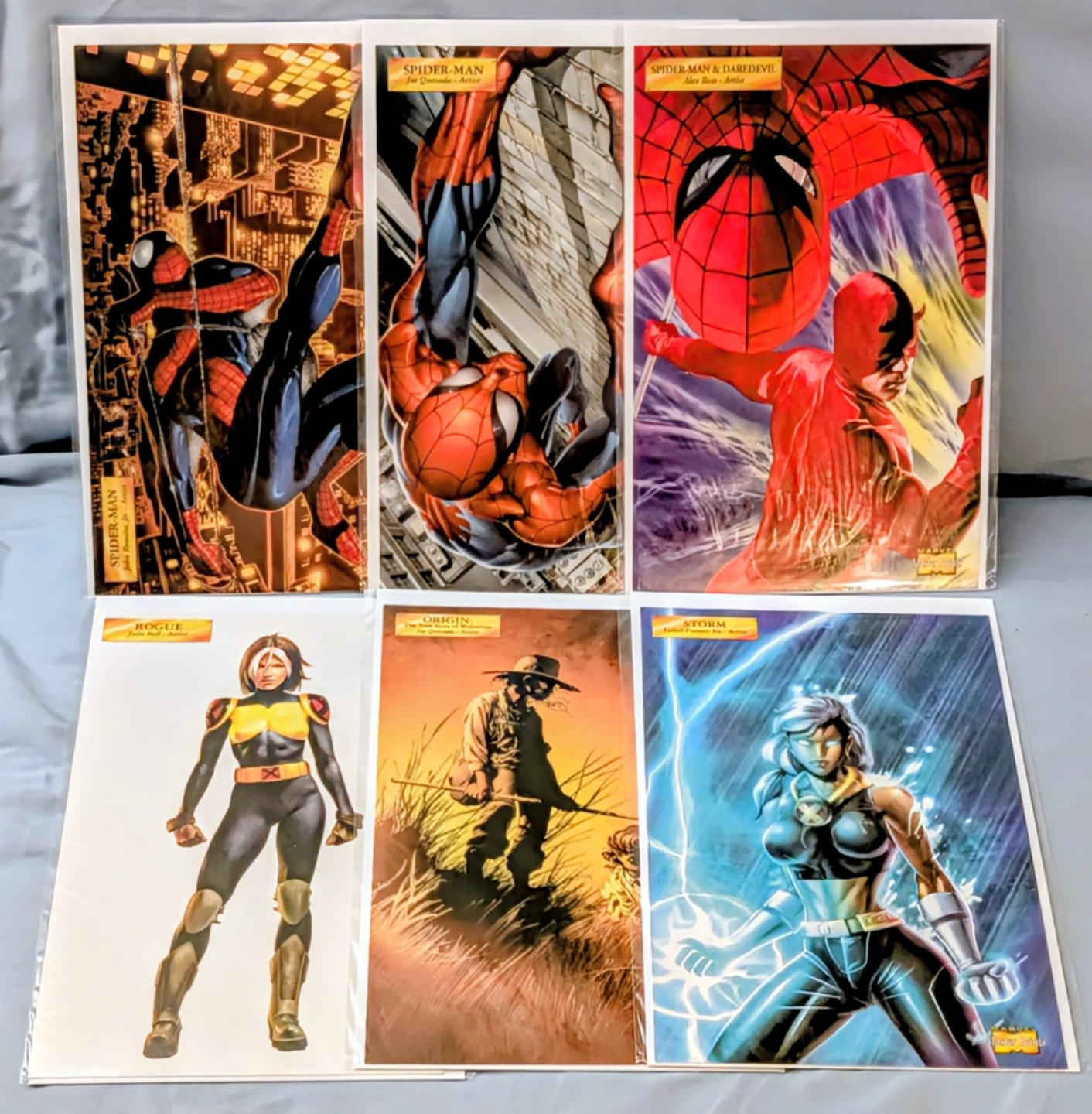 Selling a collection of Marvel comic art prints on glossy card stock. Prints are comic book size. This lot includes various titles featuring popular characters like Spider-Man, Daredevil, Rogue, Storm, Elektra, Black Widow, Captain America, Punisher, and Nick Fury. Great for any Marvel fan or collector! Cash only please.