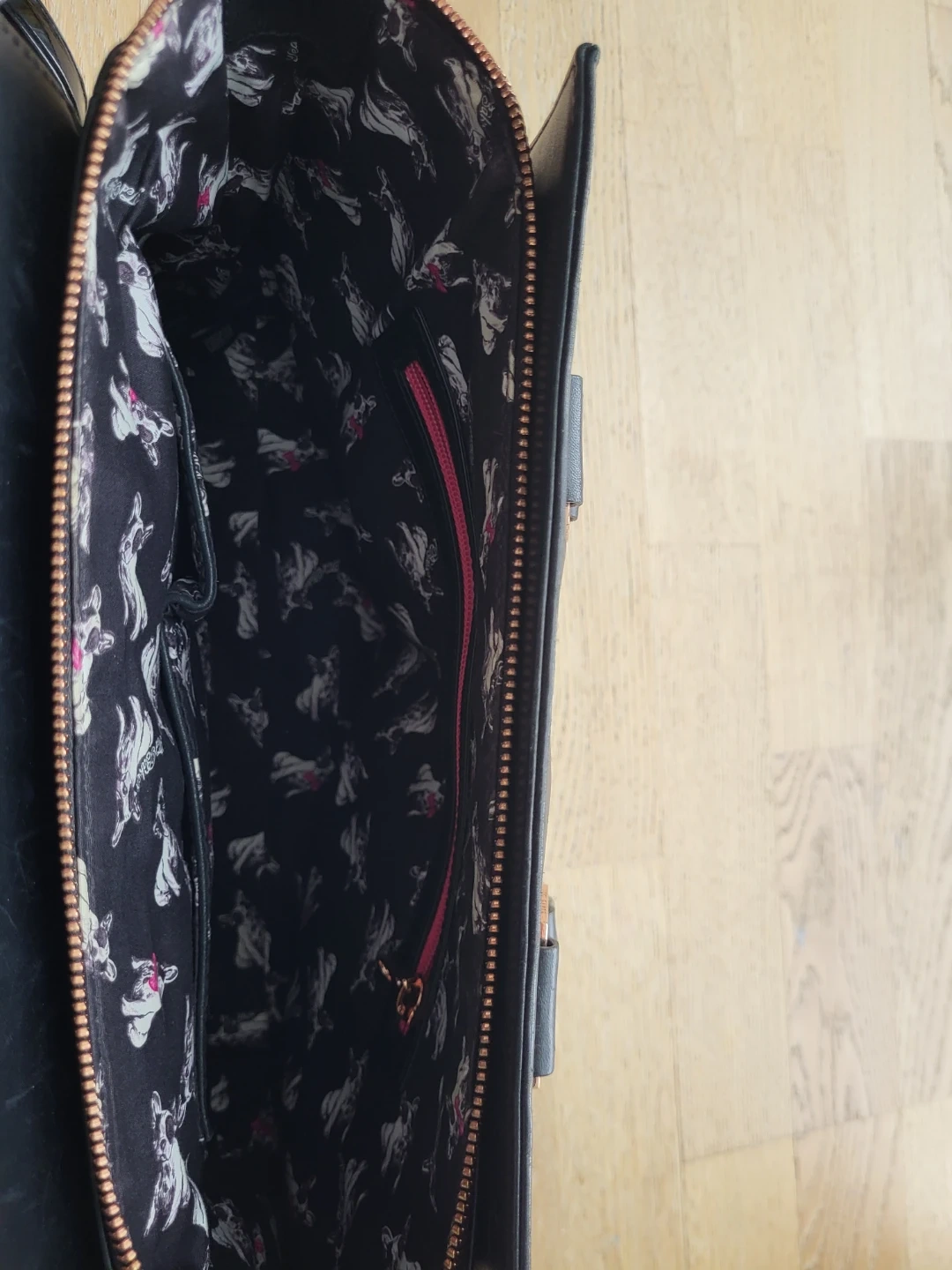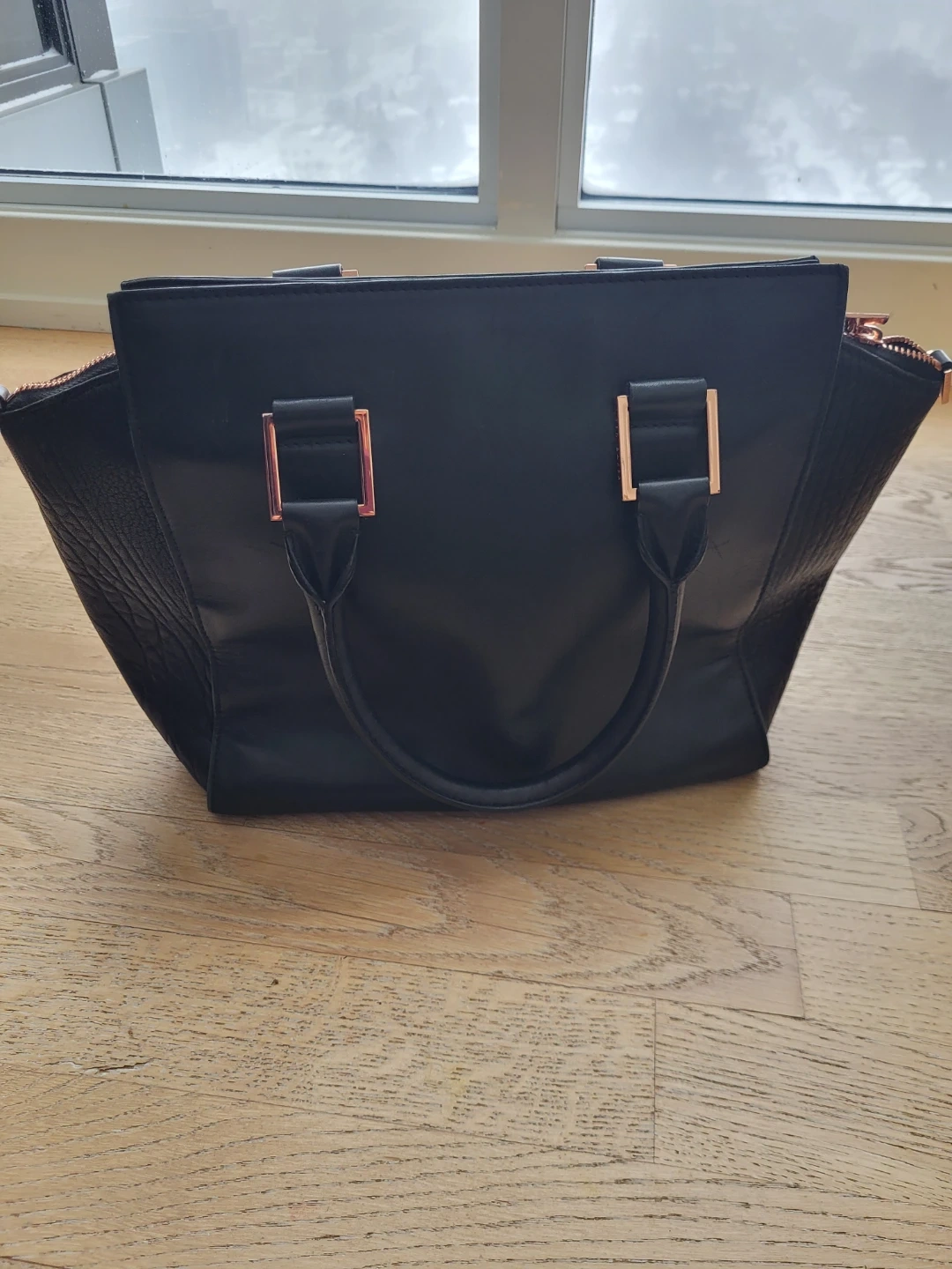 Selling a stylish Ted Baker tote bag! It's black leather with rose gold accents. The interior has a fun pattern. Perfect for everyday use!