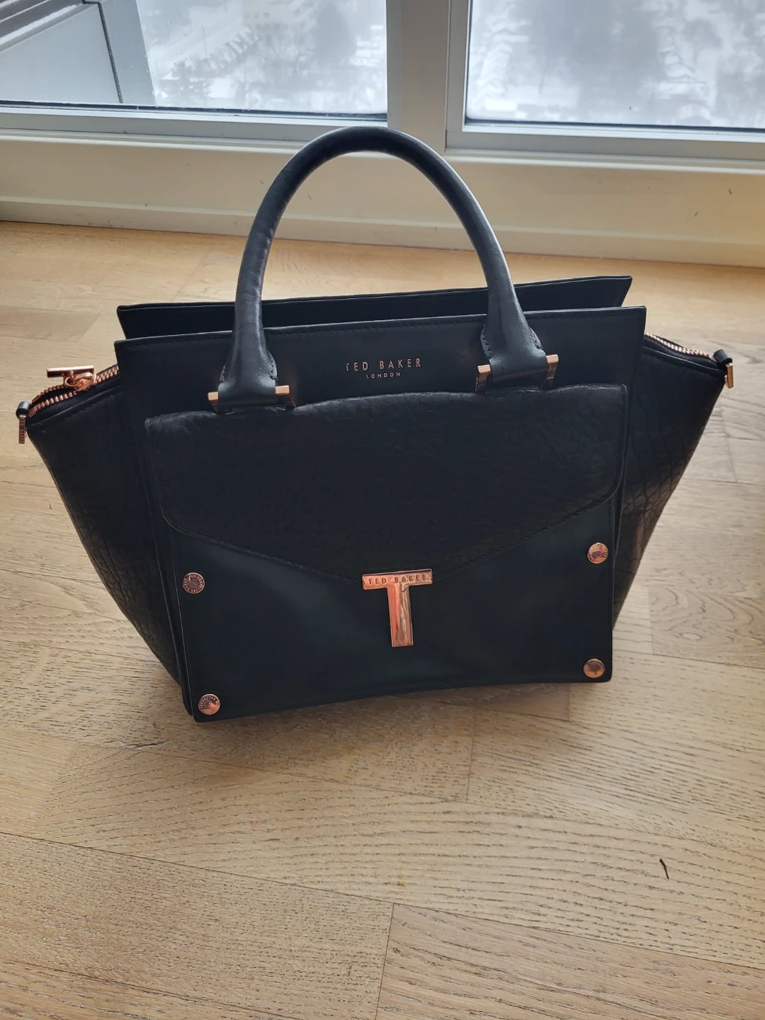 Selling a stylish Ted Baker tote bag! It's black leather with rose gold accents. The interior has a fun pattern. Perfect for everyday use!