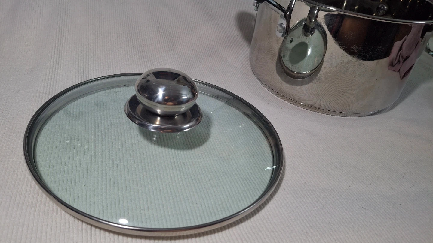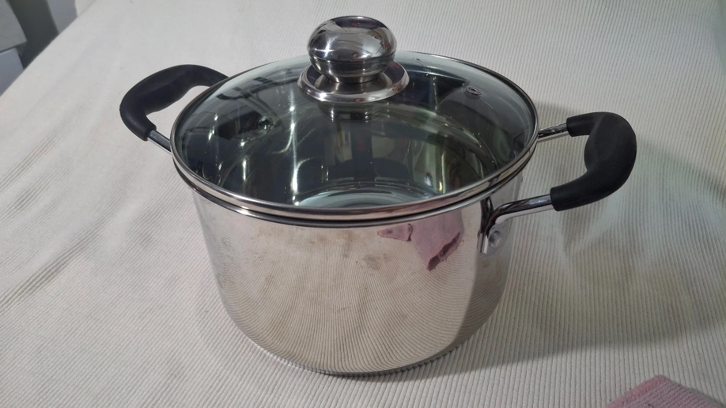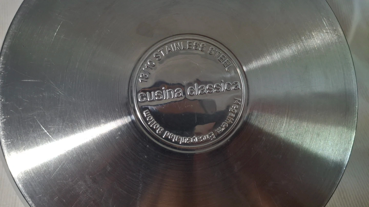 Selling a Cusina Classica stock pot made of 18/10 stainless steel. Thick bottom for induction stoves. It comes with a glass lid and black handles. Mirror finish