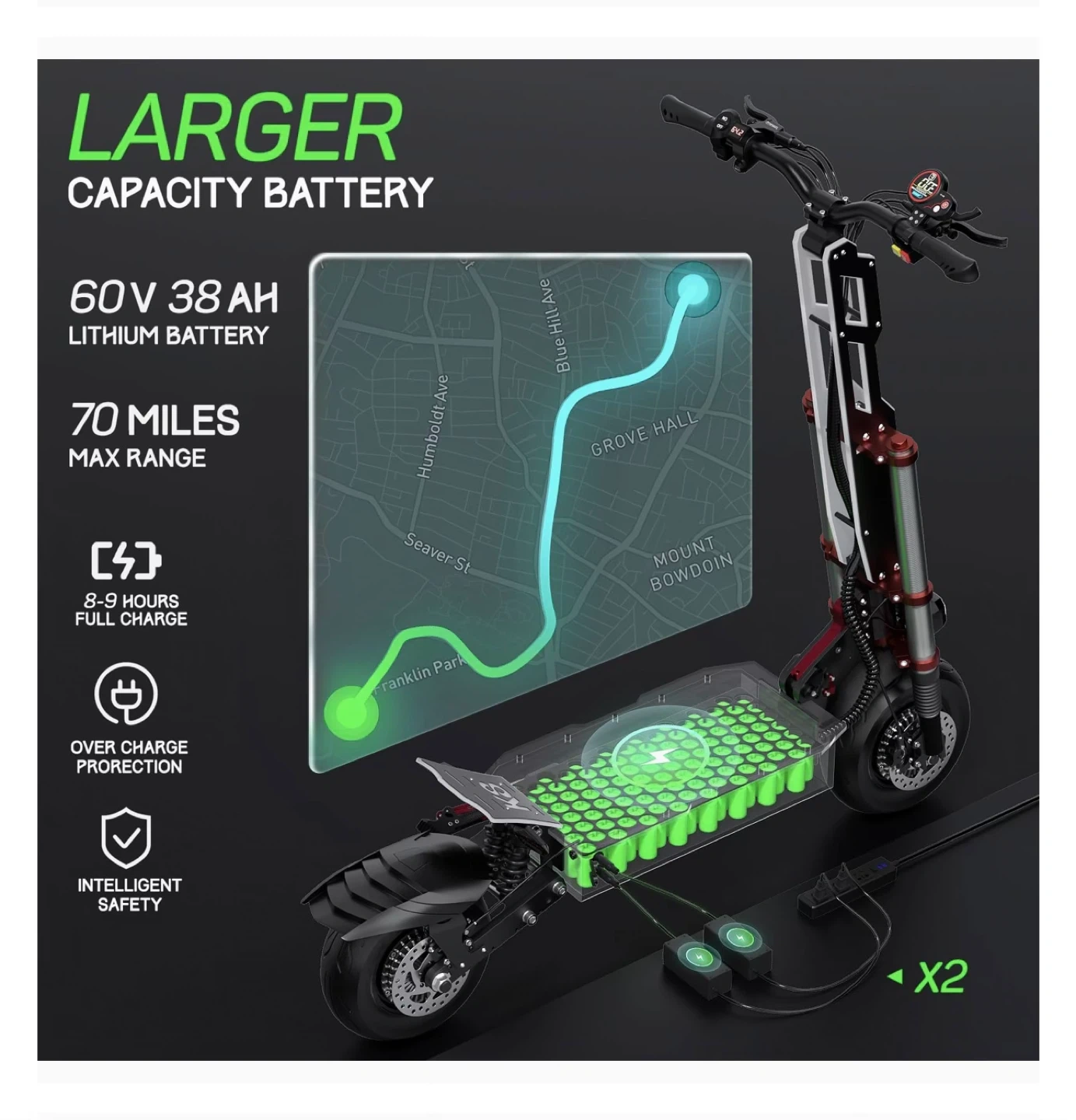 Selling a TIF GALOP K8 electric scooter! It has a larger capacity 60V 38AH lithium battery with a max range of 70 miles. The scooter features dual shock absorption and a powerful 2 x 3000W motor, offering both dual and eco modes, and 45 NM torque. It also has intelligent safety features and overcharge protection
