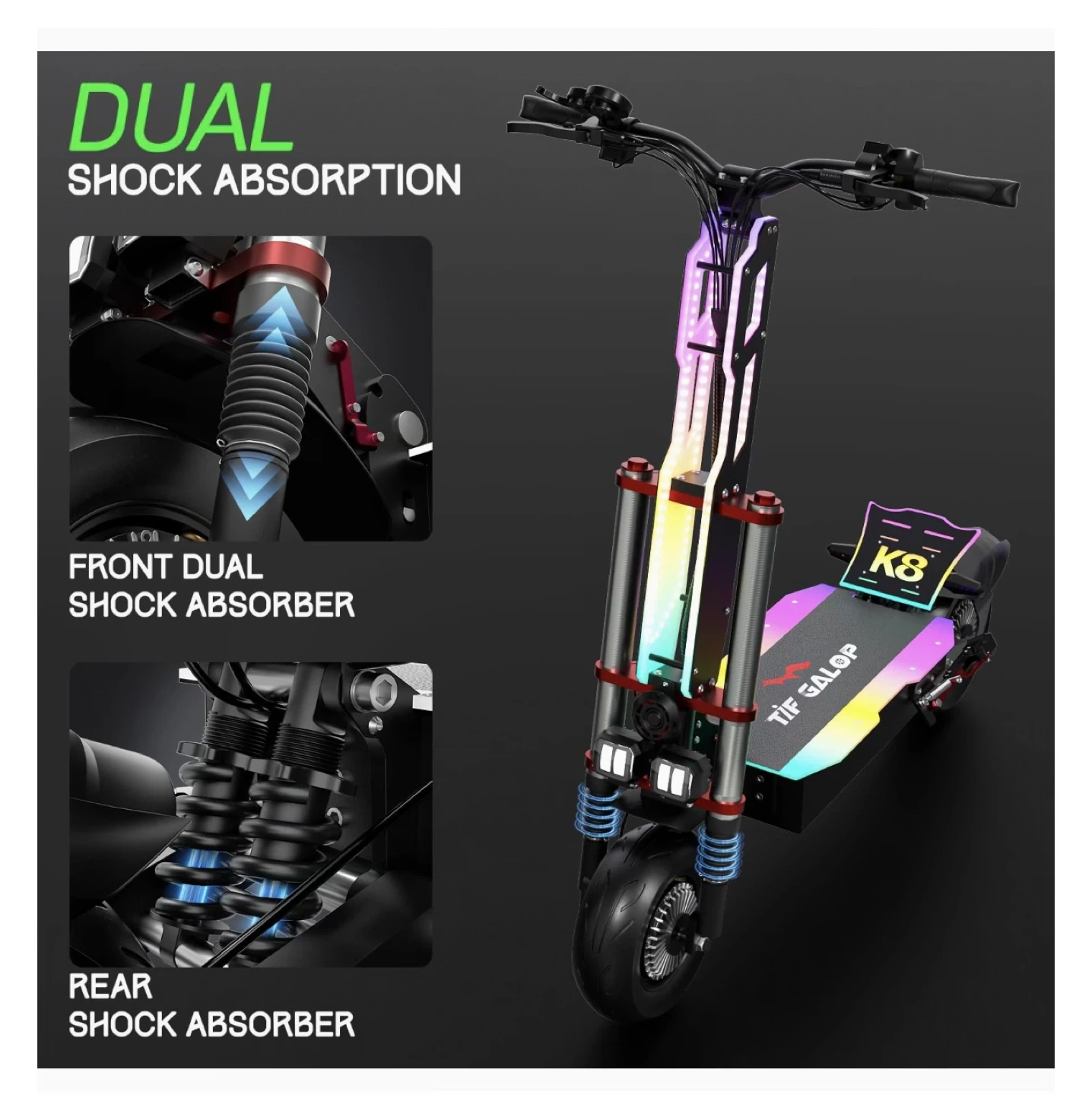 Selling a TIF GALOP K8 electric scooter! It has a larger capacity 60V 38AH lithium battery with a max range of 70 miles. The scooter features dual shock absorption and a powerful 2 x 3000W motor, offering both dual and eco modes, and 45 NM torque. It also has intelligent safety features and overcharge protection