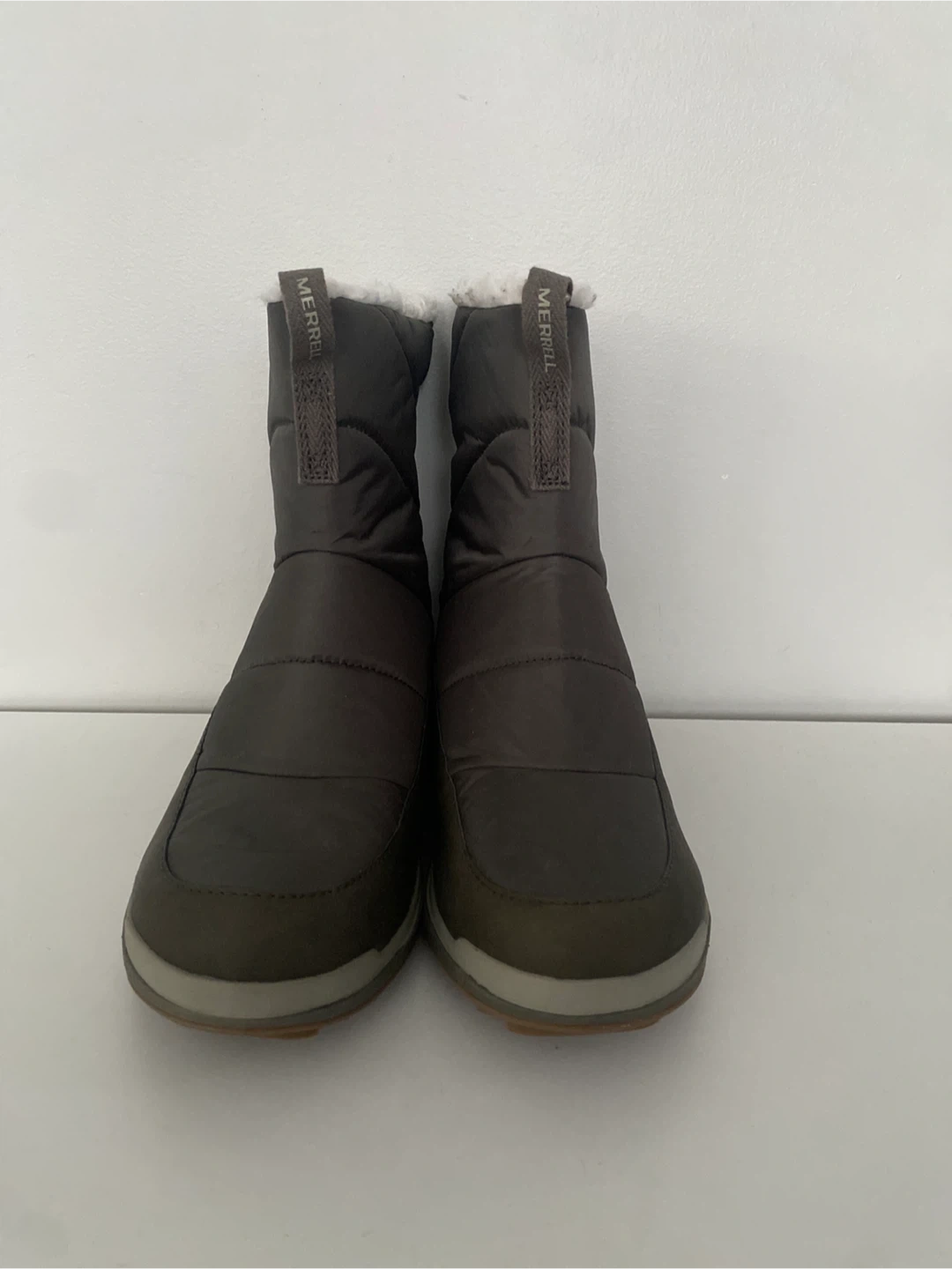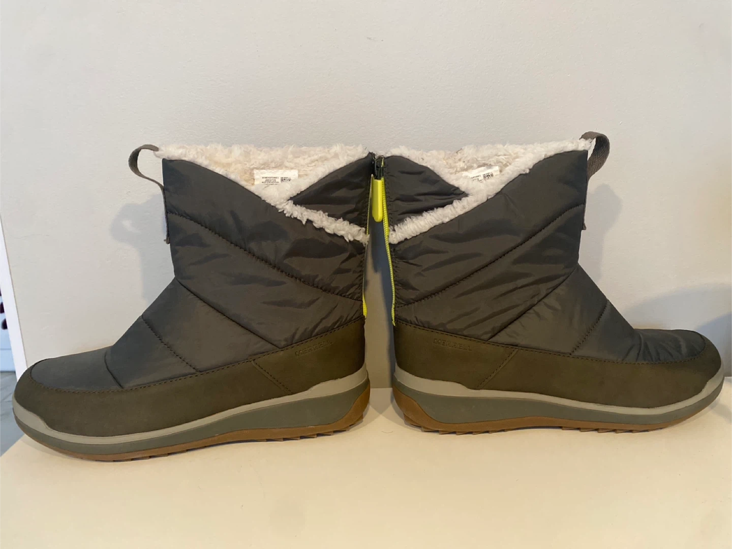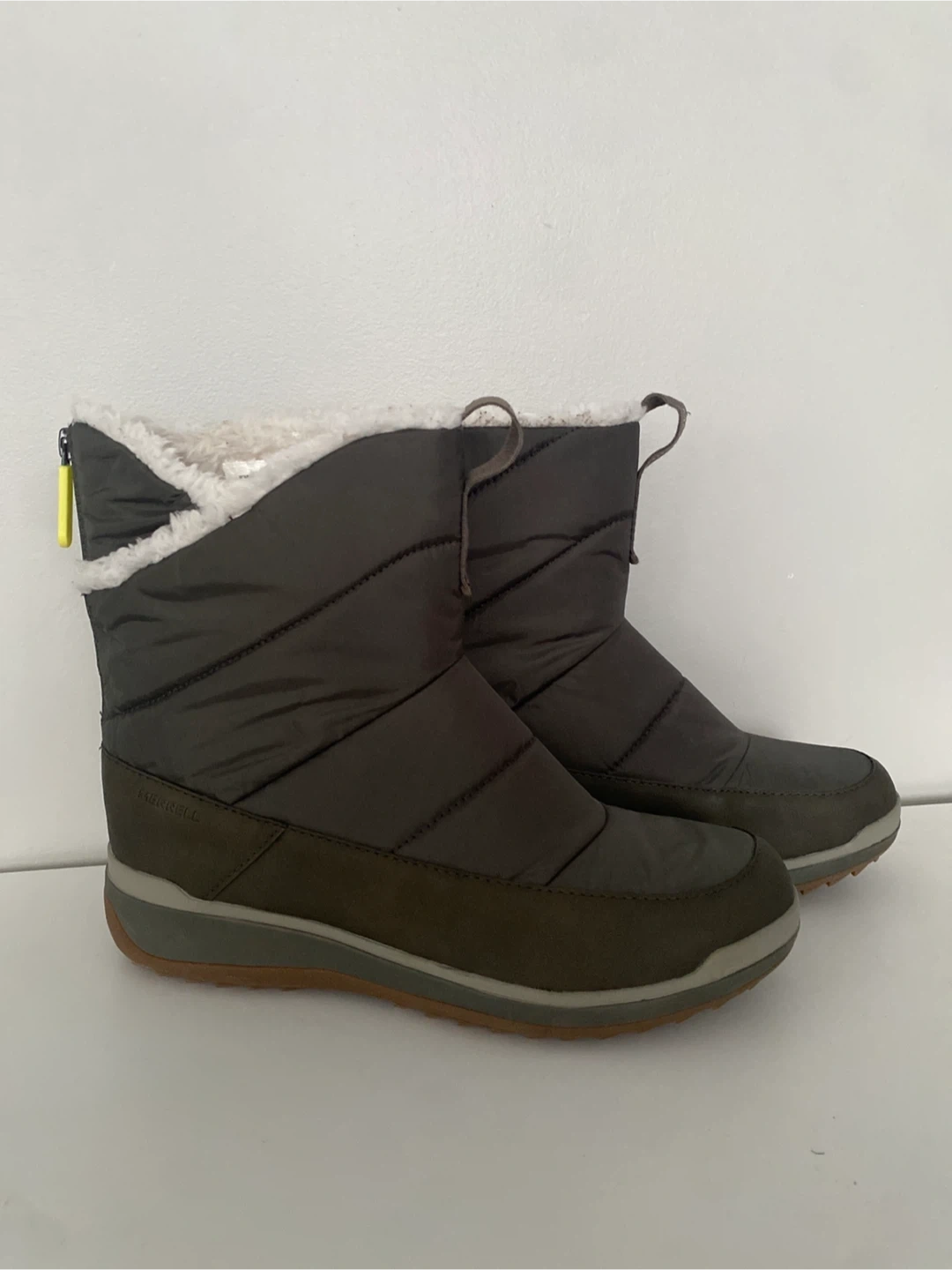 Cozy Merrell womens SNOWCREEK SPORT MID ZIP PLR Waterproof Winter Boot win olive colour, perfect for keeping your feet warm and dry this winter! They feature a convenient zipper at the back for easy on and off.