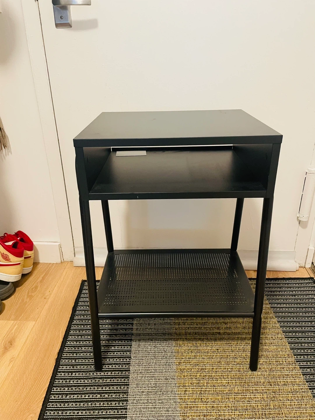 Selling a sturdy black metal side table. It features two shelves, providing ample space for storage or display. It's in great condition and ready to use in your home!
