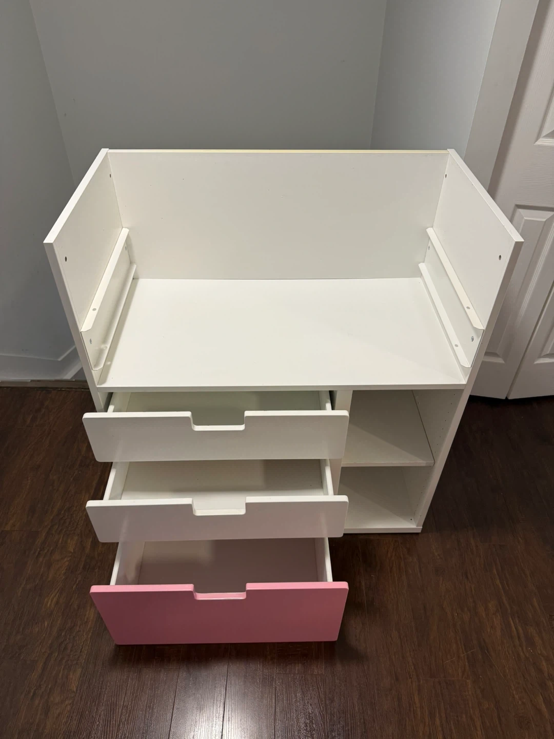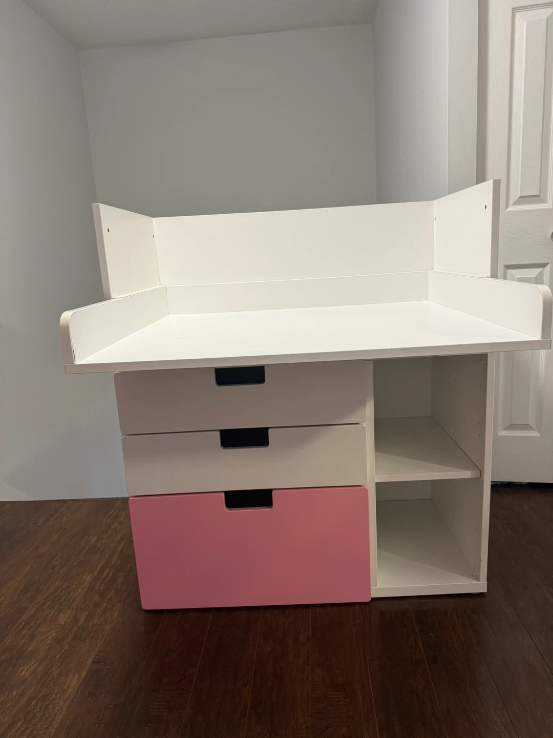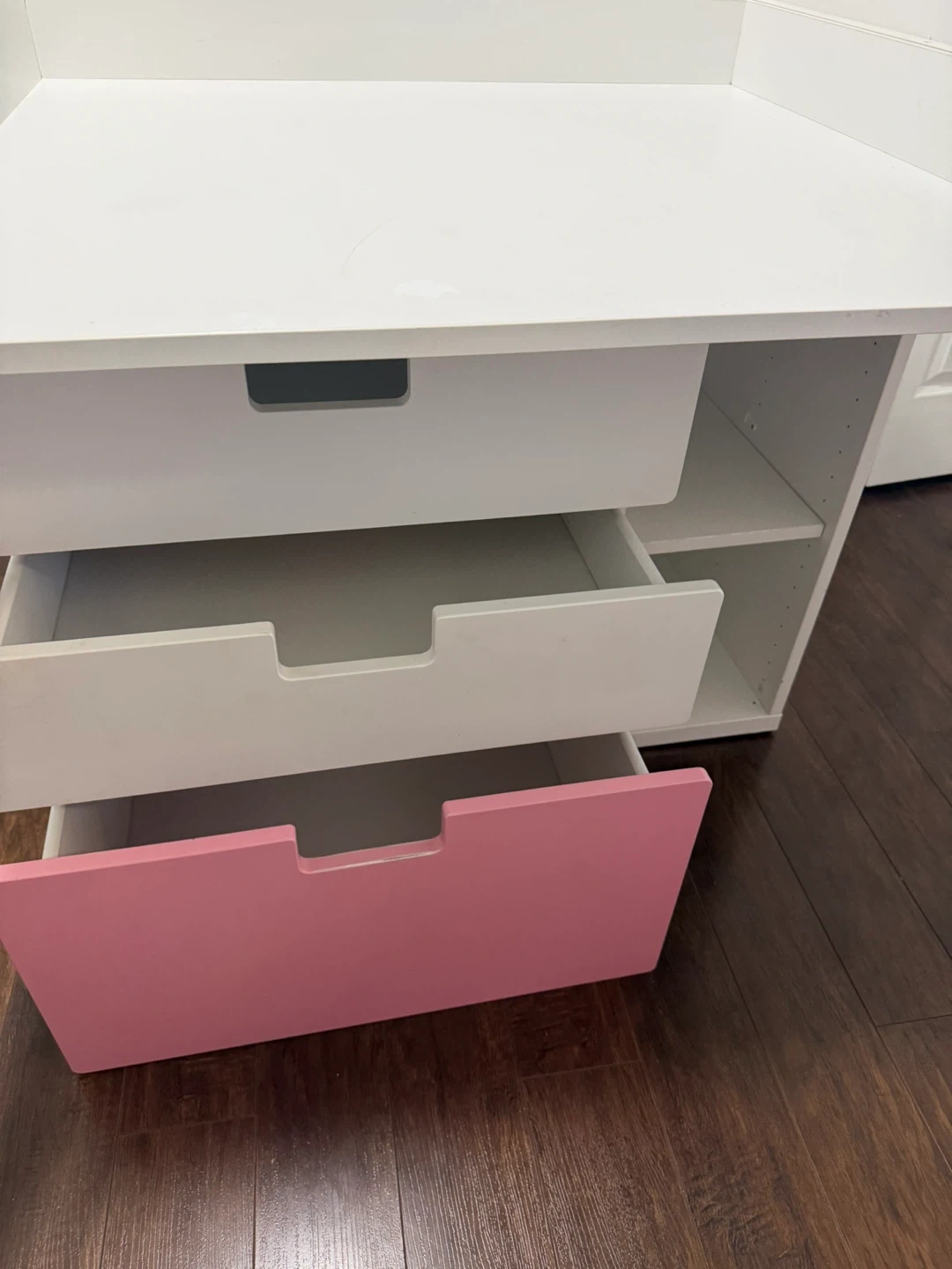 Selling a used desk. It features a clean white finish with a pop of pink on the bottom drawer. Had a couple pencil markings and scratches but still in very decent condition. Retail value is over $300