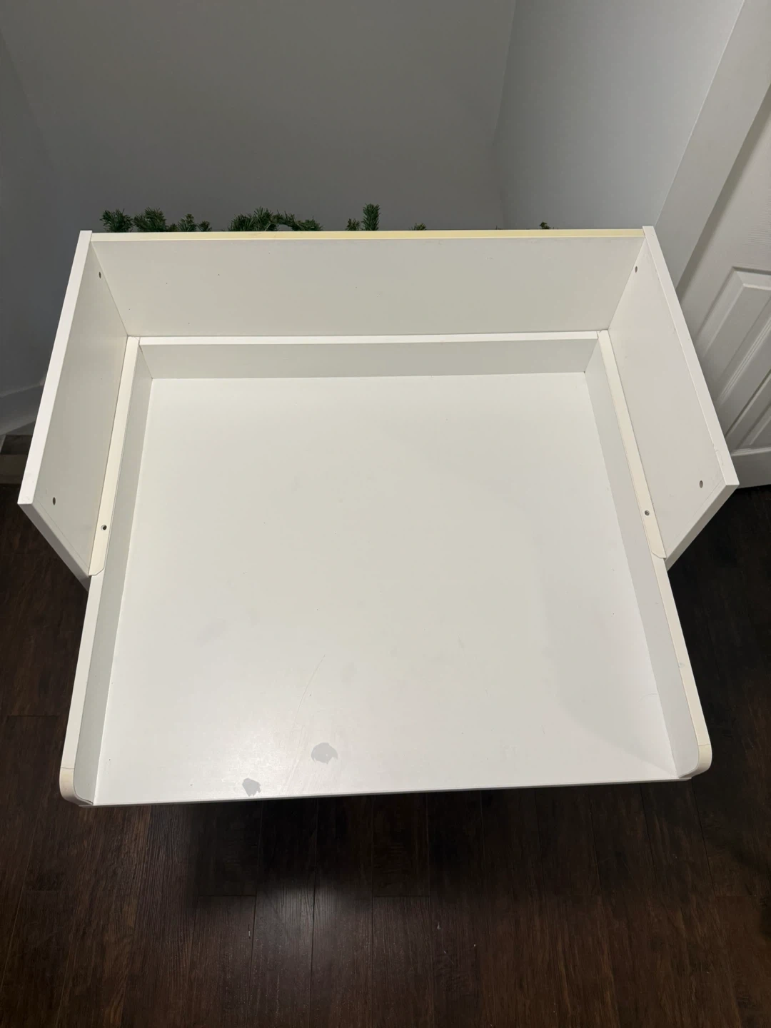 Selling a used desk. It features a clean white finish with a pop of pink on the bottom drawer. Had a couple pencil markings and scratches but still in very decent condition. Retail value is over $300