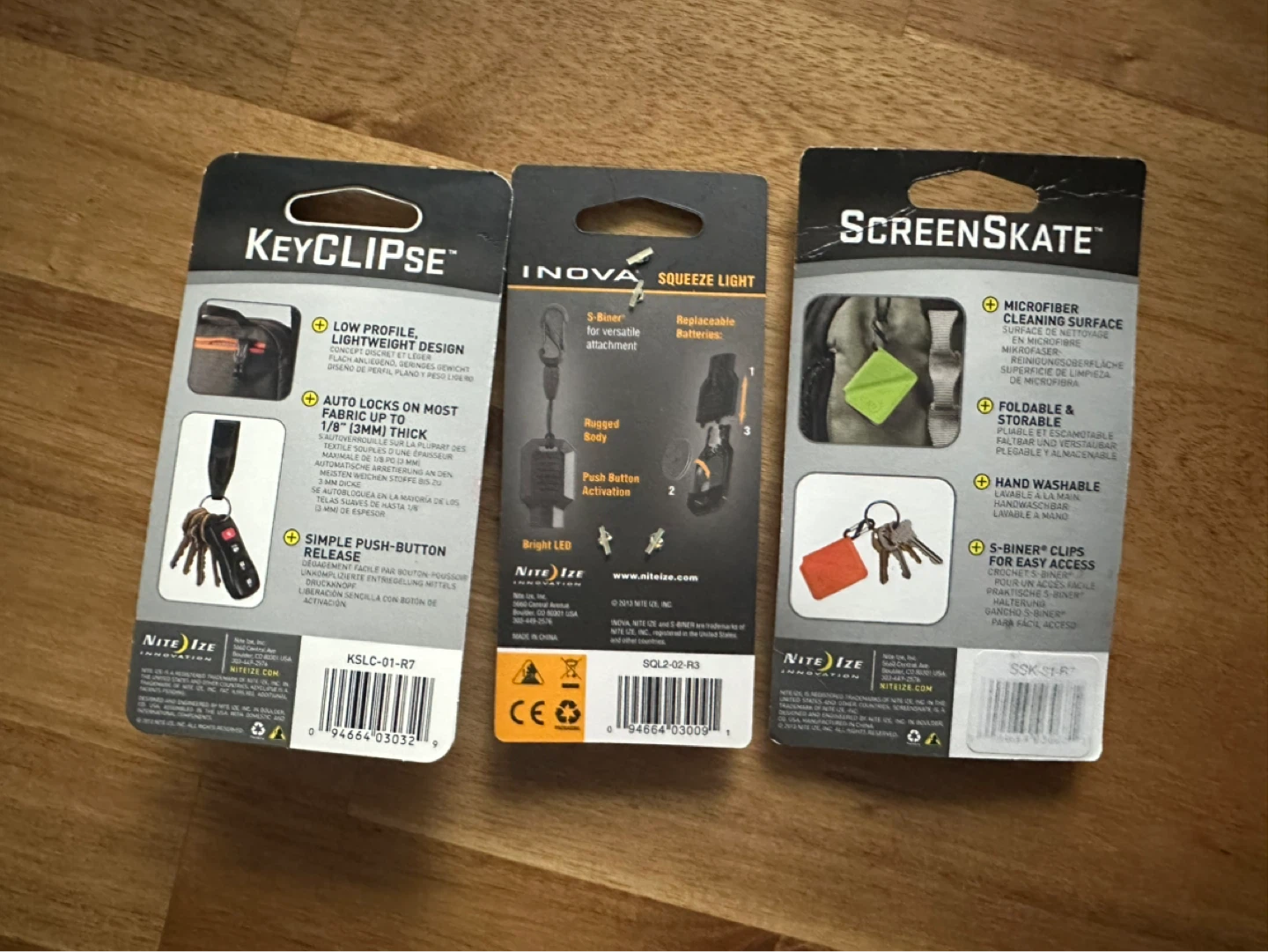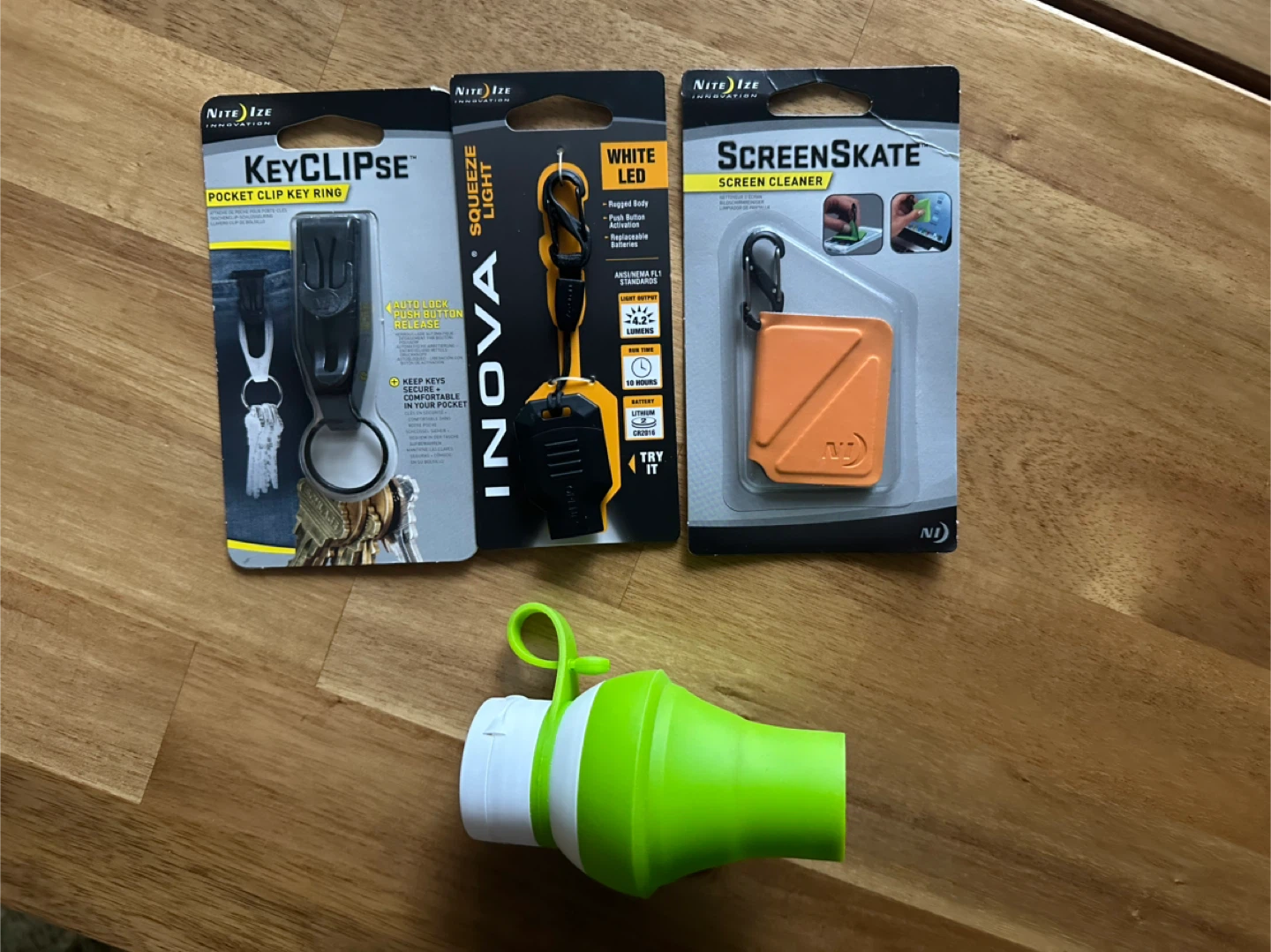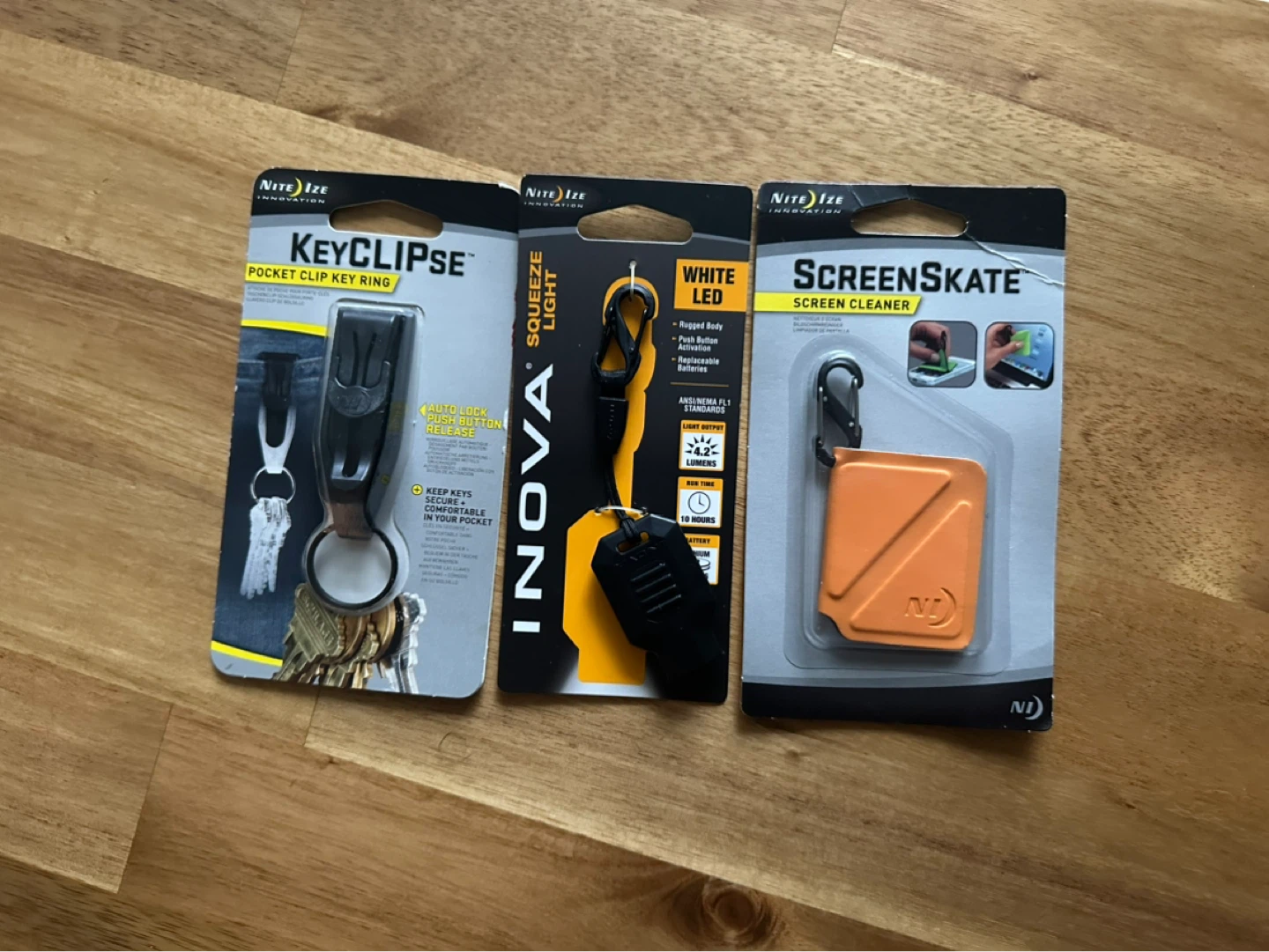 Selling a bundle of unopened Nite Ize accessories! You'll get a KeyClipse pocket clip key ring, an Inova Squeeze Light, and a ScreenSkate screen cleaner. Great for keeping your keys organized and your screens clean. Plus you’ll receive a bonus new collapsible silicone squeeze tube, which is great for travelling.