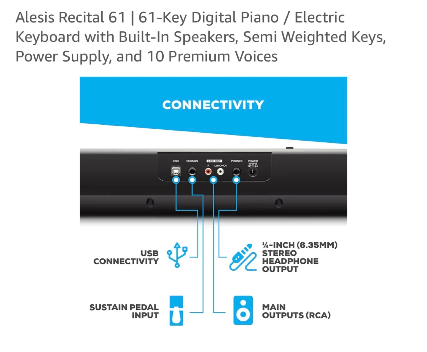 Alesis Recital 61-key digital piano! It comes with built-in speakers, semi-weighted keys, a power supply, and 10 premium voices.