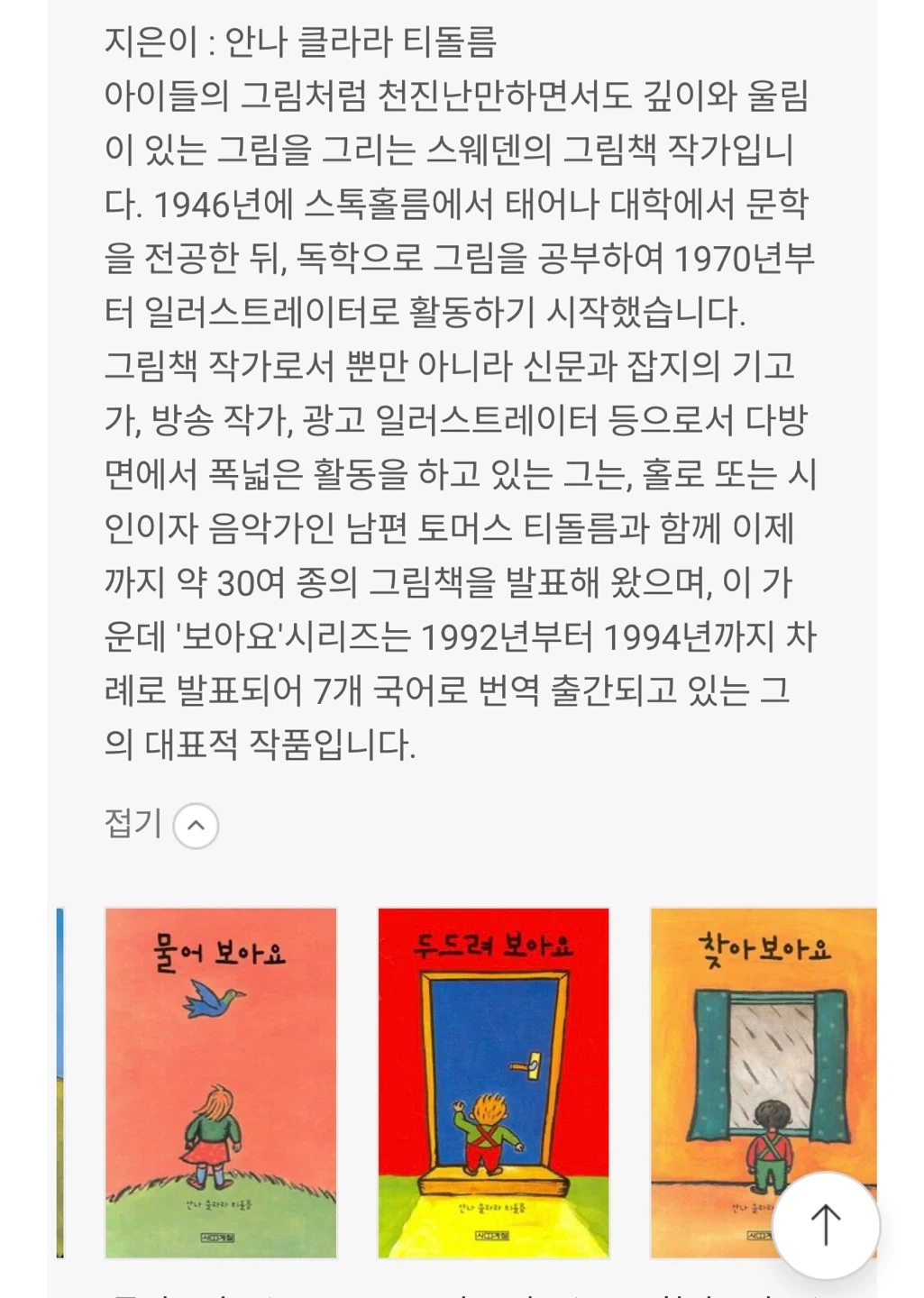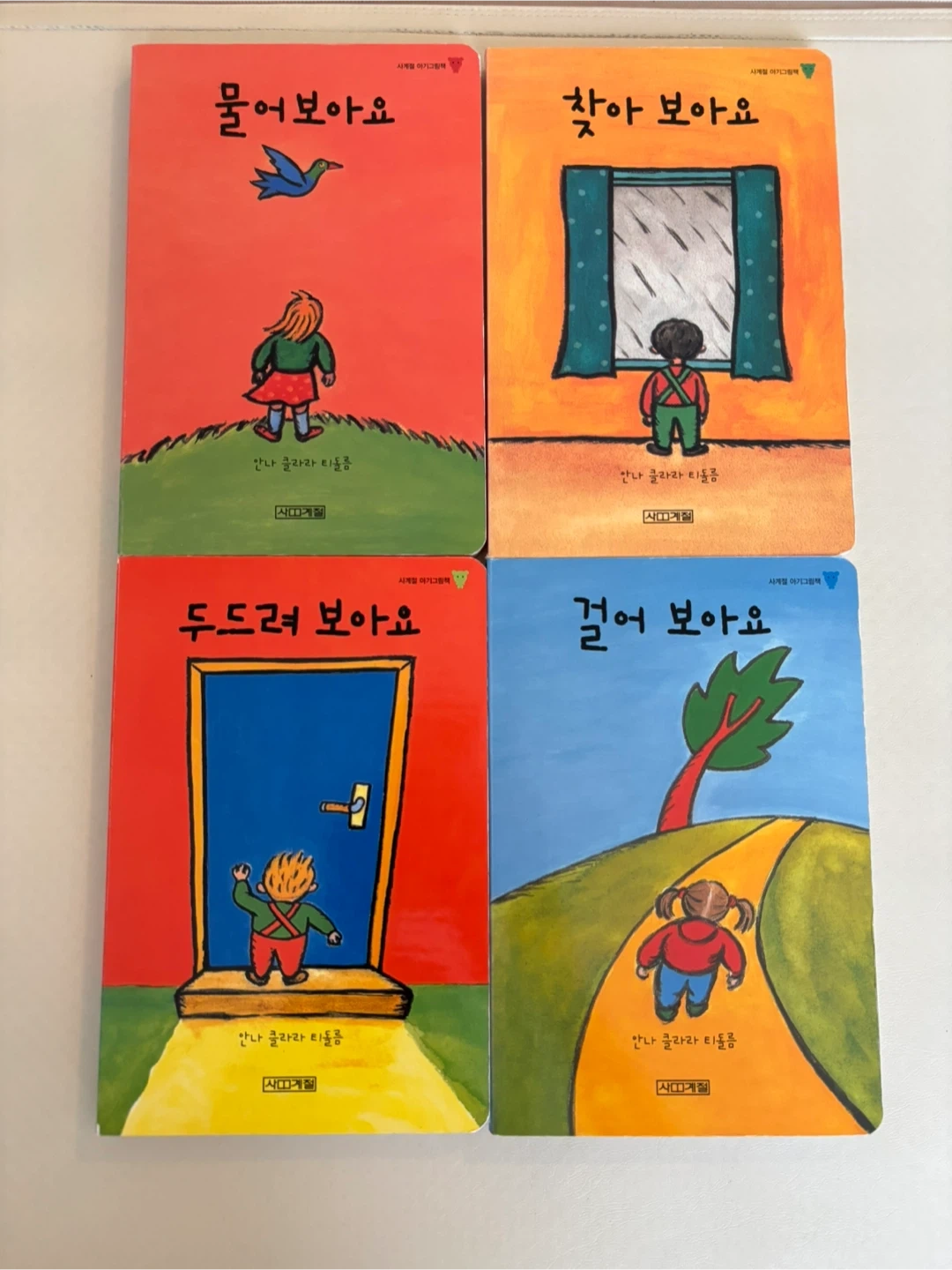시리즈 특징 - 책을 펴는 순간 스스로 책 속의 주인공이 되는 독특한 그림책 막 말을 배우기 시작하는 만 1세부터 3세 어린이에게 알맞은 그림책. 책을 펴는 순간 독자들이 스스로 책 속의 주인공이 되는 독특한 그림책입니다. 책을 읽는 유아들은 누군가의 이야기를 읽기만 하는 것이 아니라 책이 거는 말에 대답도 하고 책 속의 주인공이 되어 책 속의 놀이를 즐기게 됩니다. 이러한 설정으로 유아들은 자연스럽게 책 읽는 놀이의 즐거움에 빠져듭니다. 유아들은 이 책 속의 문을 두드려 보고, 사물들을 찾아보고, 길을 걸어 보고, 궁금한 것을 물어 보면서 색깔과 모양에 대한 감각과 여러 가지 사물에 대한 인지 능력, 그리고 그것을 표현하는 언어 능력을 키워 갑니다. Selling a set of four children's books by Anna Clara Tidholm. The books are titled: - 물어 보아요 (Ask) - 찾아 보아요 (Find) - 두드려 보아요 (Knock) - 걸어 보아요 (Walk) These books are great for young children and feature simple, engaging illustrations