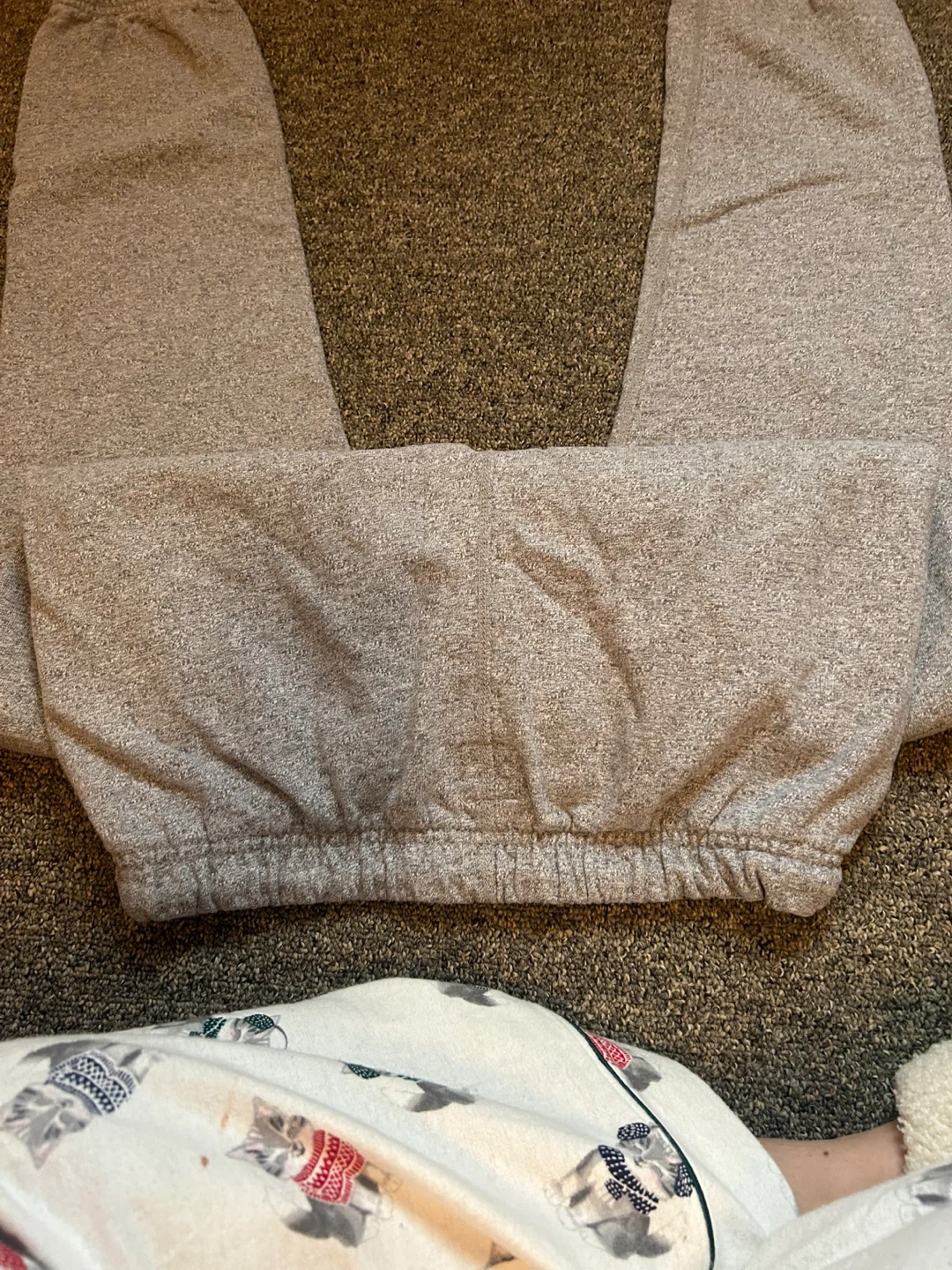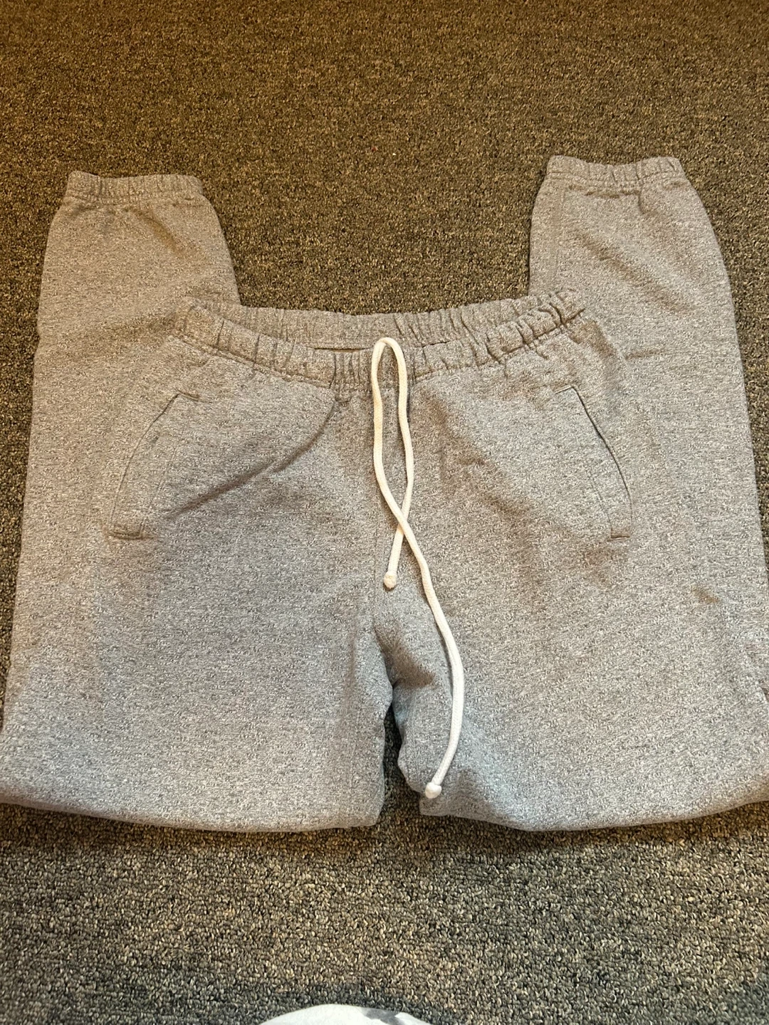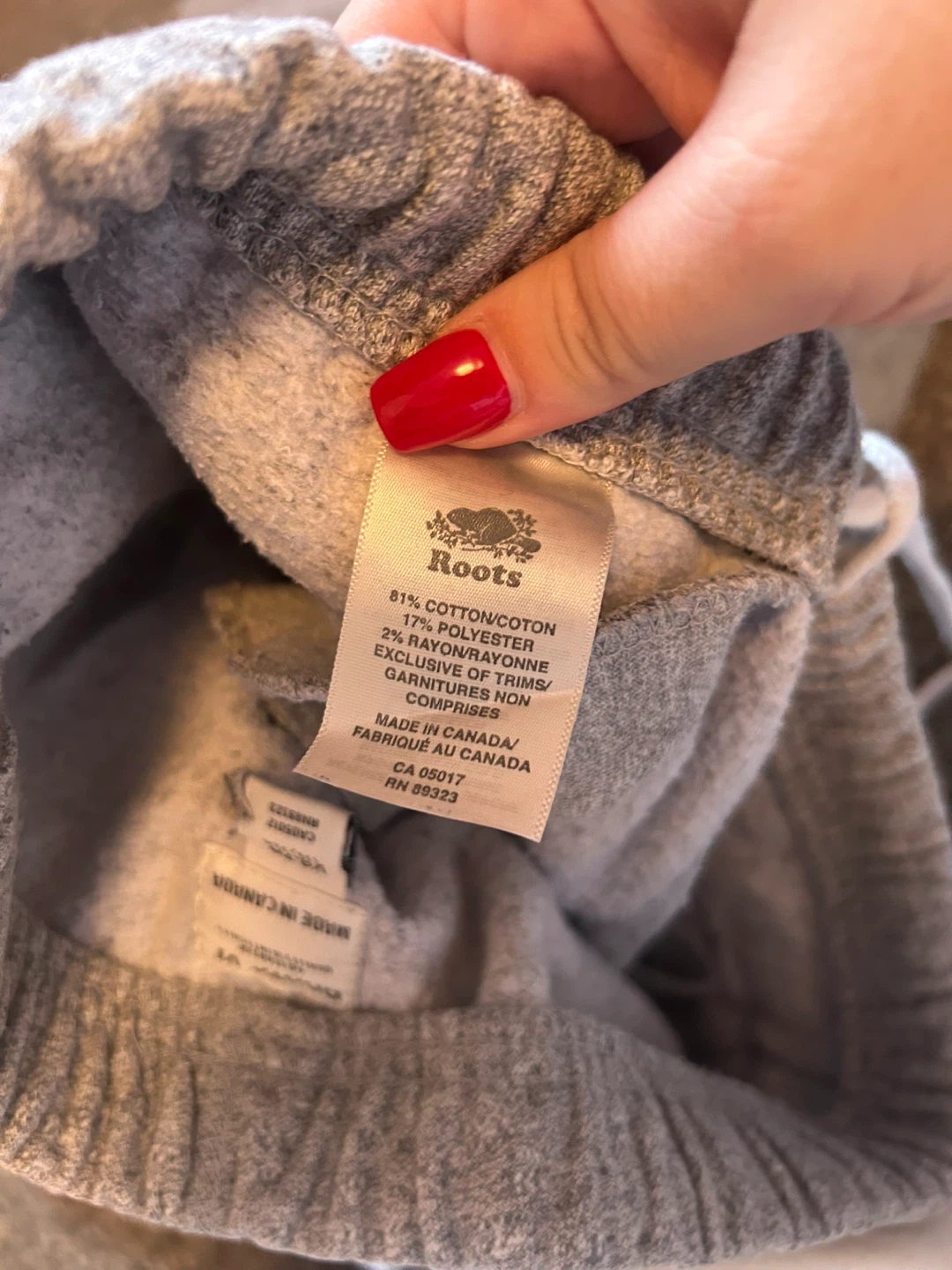 Selling a pair of comfy grey Roots sweatpants. They are a size XL and made in Canada! The material is 81% cotton, 17% polyester, and 2% rayon