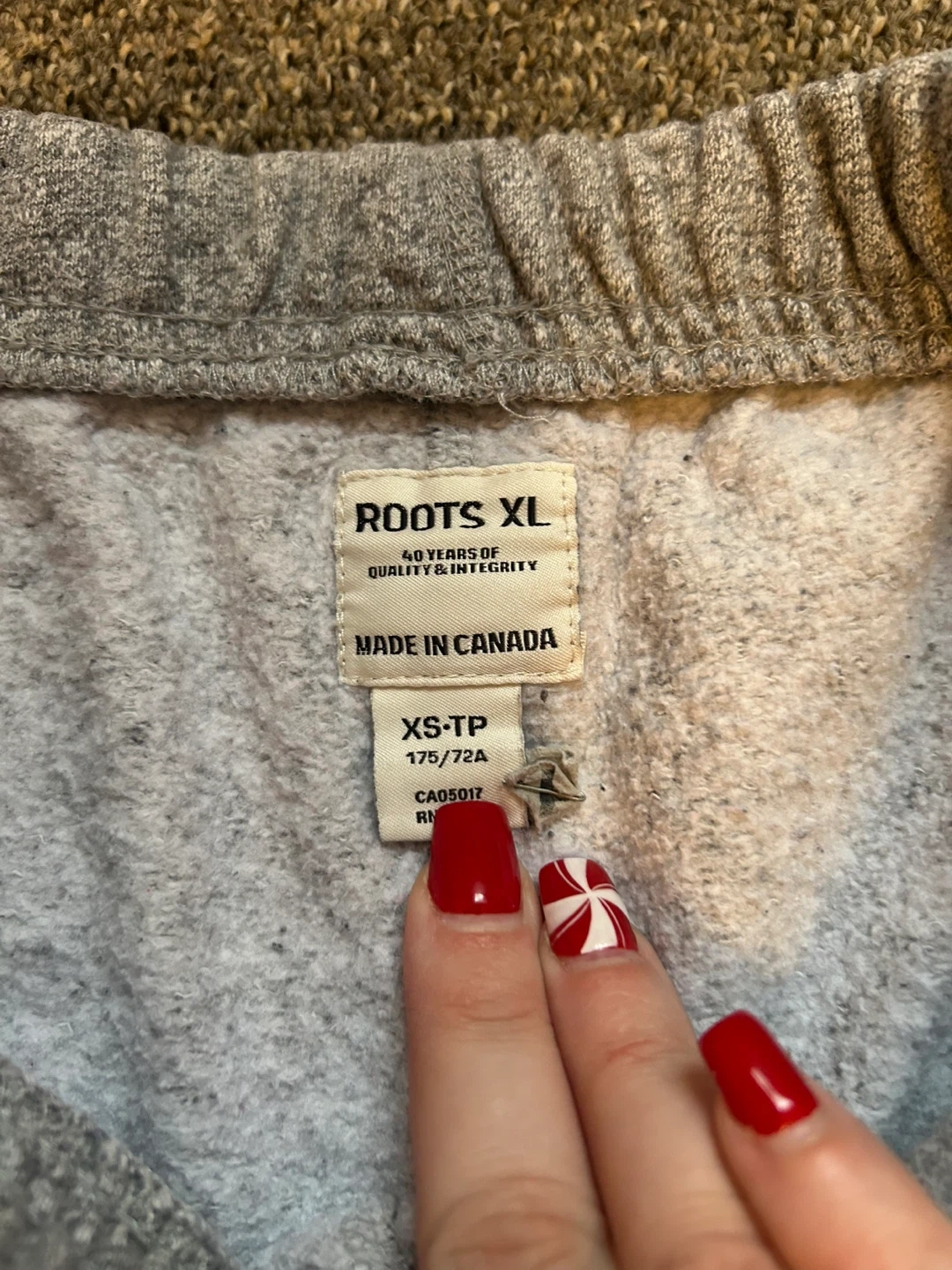 Selling a pair of comfy grey Roots sweatpants. They are a size XL and made in Canada! The material is 81% cotton, 17% polyester, and 2% rayon