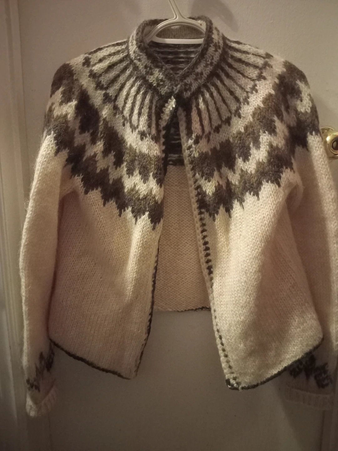 Selling a cozy hand-knitted wool cardigan in cream and brown. It features a unique patterned design. Perfect for layering during cooler weather! Asking $35