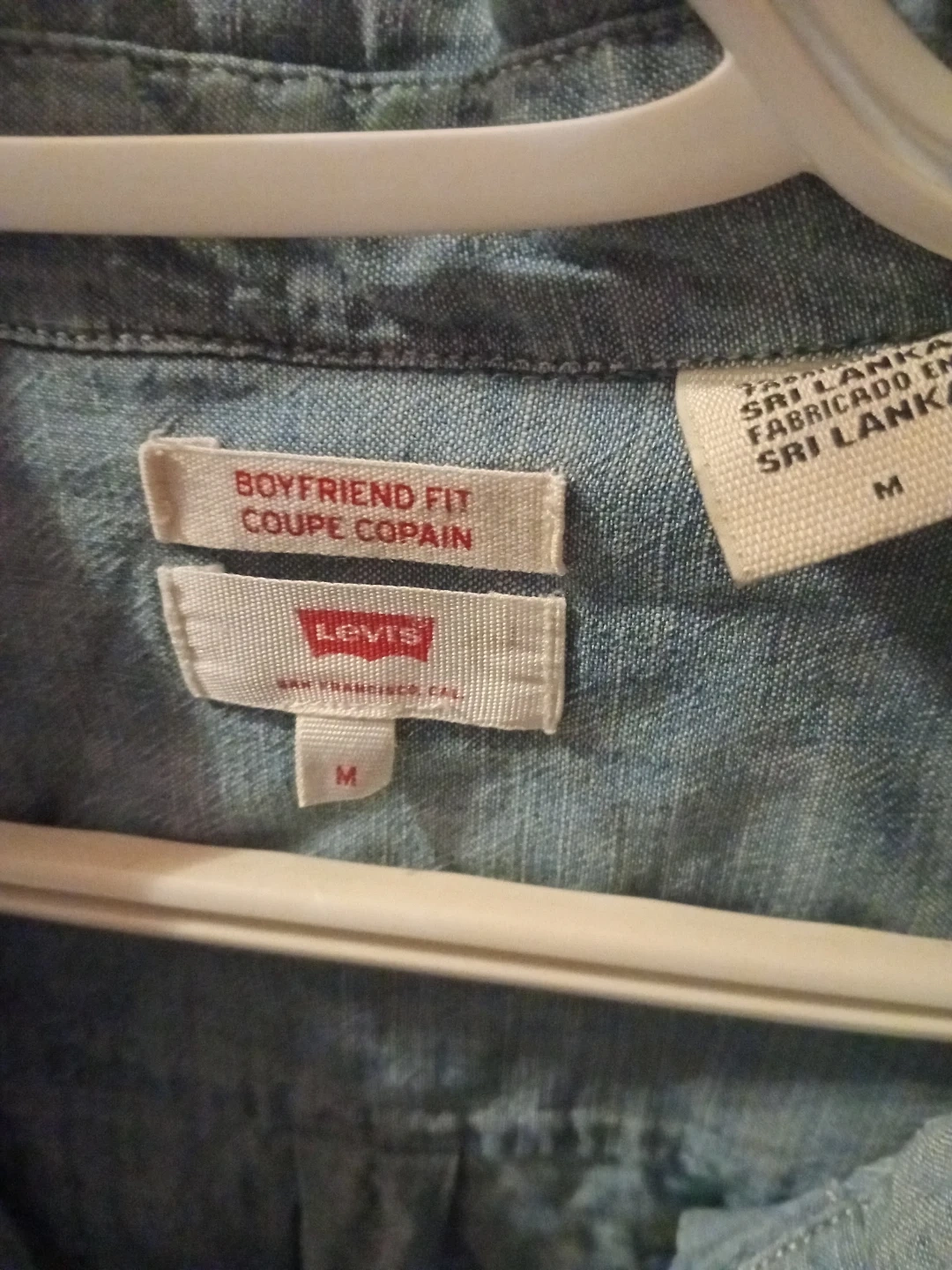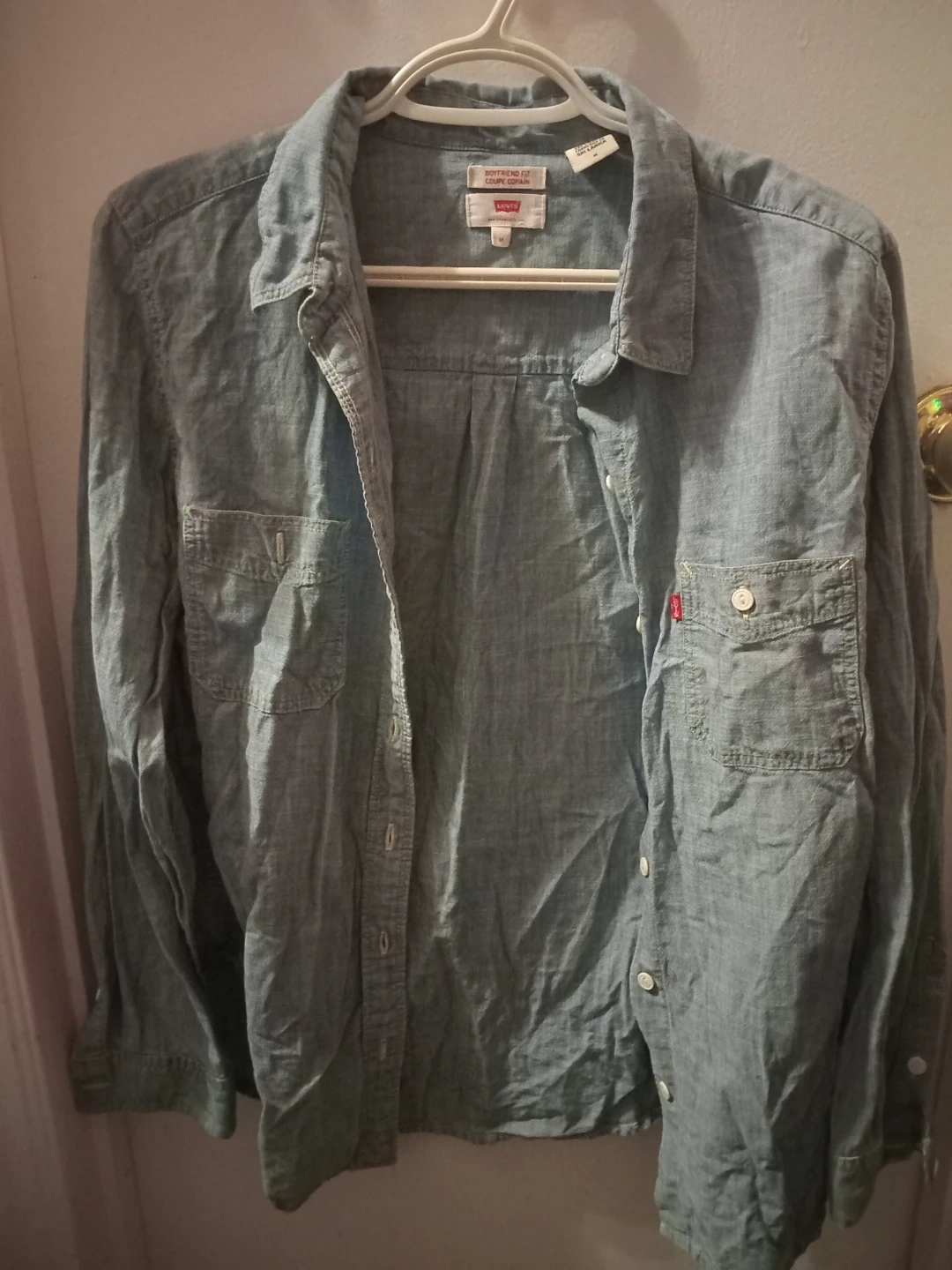 Here's a Levi's Boyfriend Fit shirt in size M. It's a light blue colour and made of a comfortable material. Perfect for a casual look!