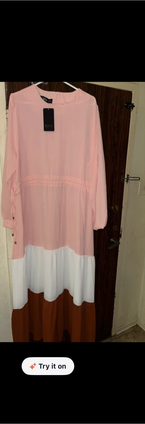Selling two lovely dresses! One is a beautiful blue colour with decorative trim on the sleeves. The other is a charming pink, white, and brown colour block dress. Both are in great condition and ready for a new home! Each 30$
