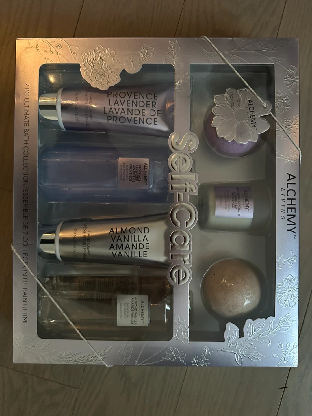 This is a lovely Alchemy Living 7-piece ultimate bath collection. It includes Provence Lavender hand cream (70ml), Provence Lavender bubble bath (260ml), Almond Vanilla hand cream (120ml), and Almond Vanilla shower gel. Perfect for a self-care day!