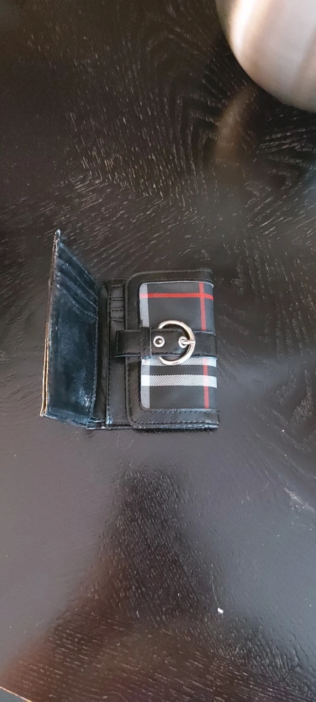 Selling a Burberry wallet with a plaid design. It has some signs of wear, but it's still functional and stylish!