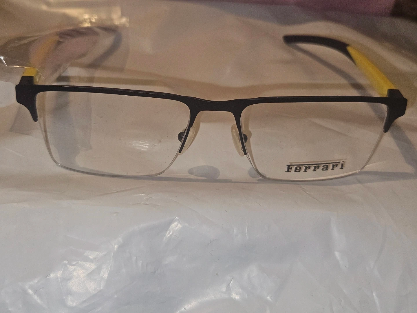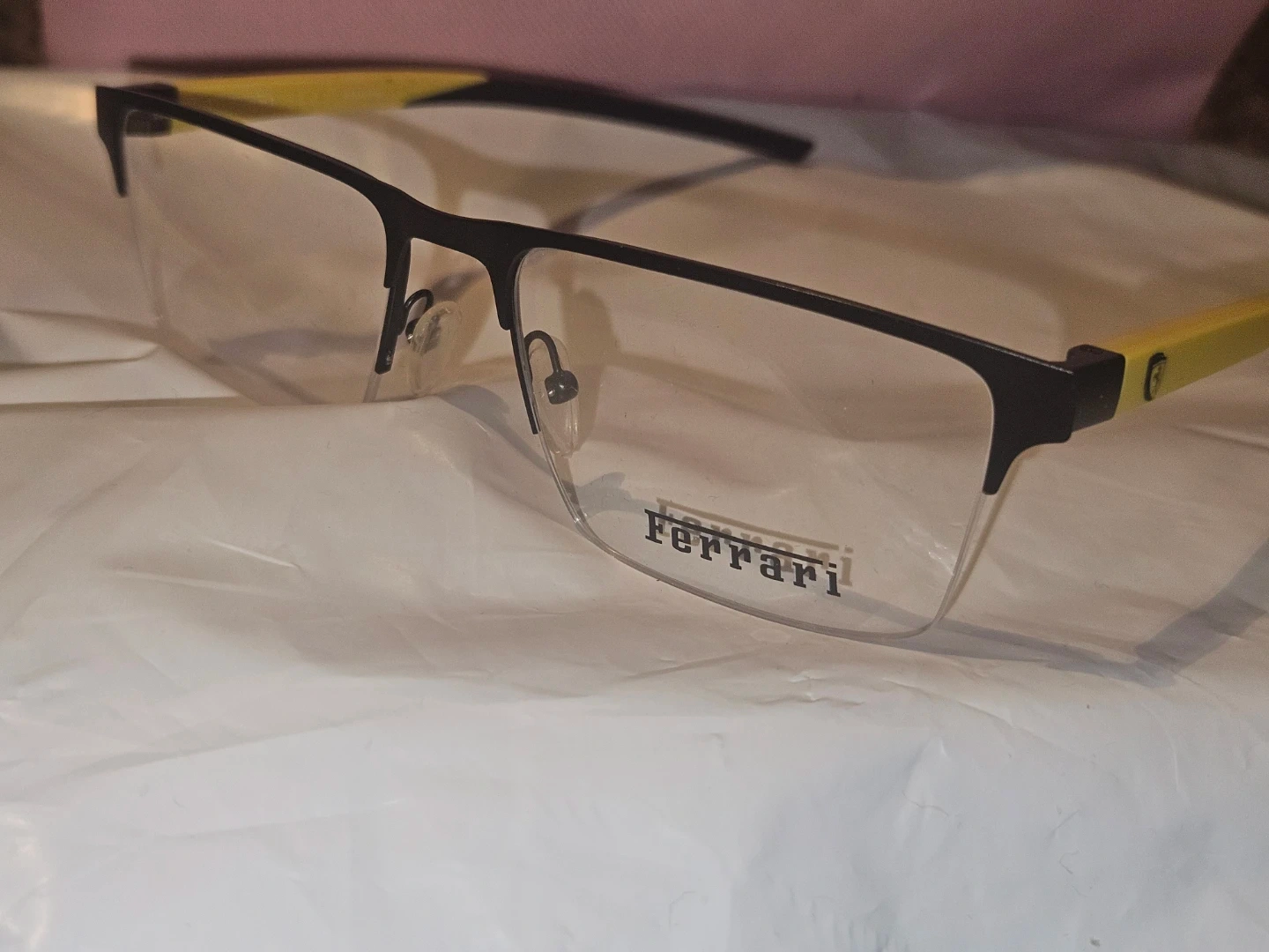 Selling a pair of Ferrari eyeglasses! They feature a sleek black frame with vibrant yellow accents silicon grip soft plastic the arms. The Ferrari logo is subtly displayed. Great for adding a touch of style to your everyday look, semi rim, suitable for all prescription.