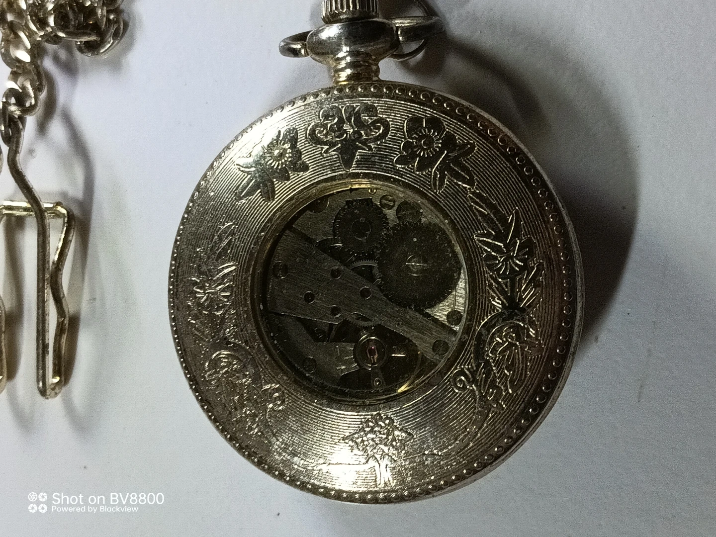 Selling a vintage-style pocket watch with a chain. It features Roman numerals and intricate detailing on the case. The back is clear, showing the inner workings of the watch. A unique and stylish accessory!