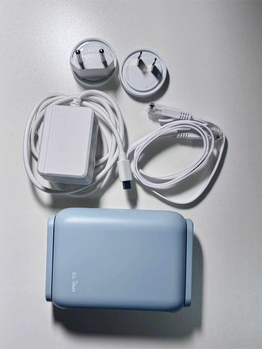 GL.iNet Beryl AX (GL-MT3000) Wi-Fi 6 travel router. Used in great condition. Comes with a travel case, worldwide power adapter with North American and European plugs, and a flat Ethernet cable.