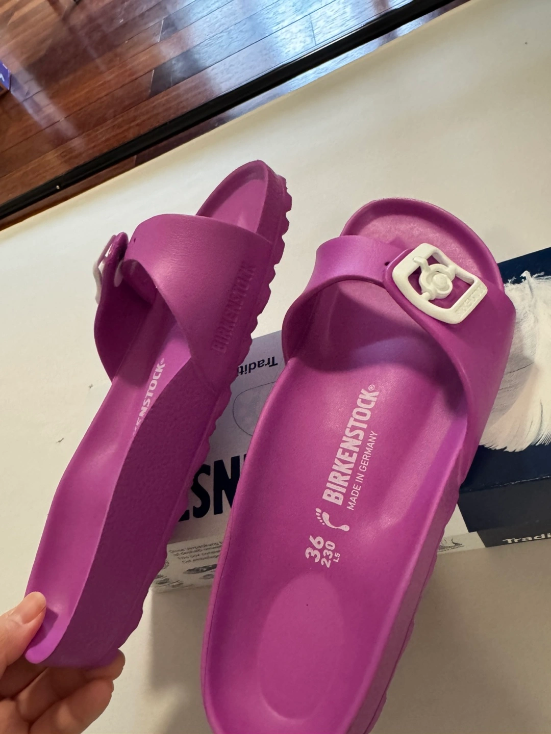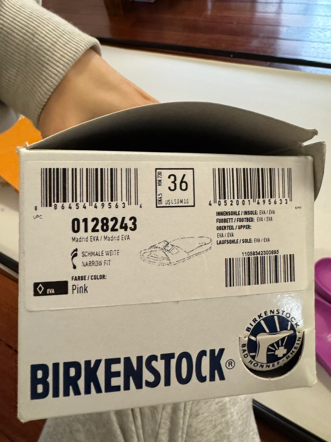 Selling a pair of Birkenstock Madrid EVA sandals in pink! They are a size 36. These have a narrow fit and are made of EVA material. Comes with the original box!