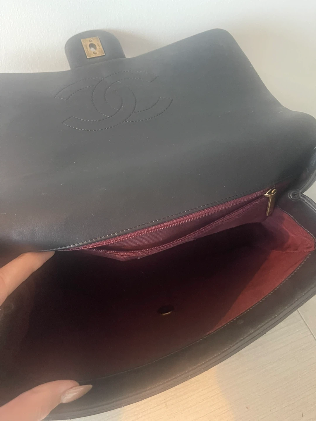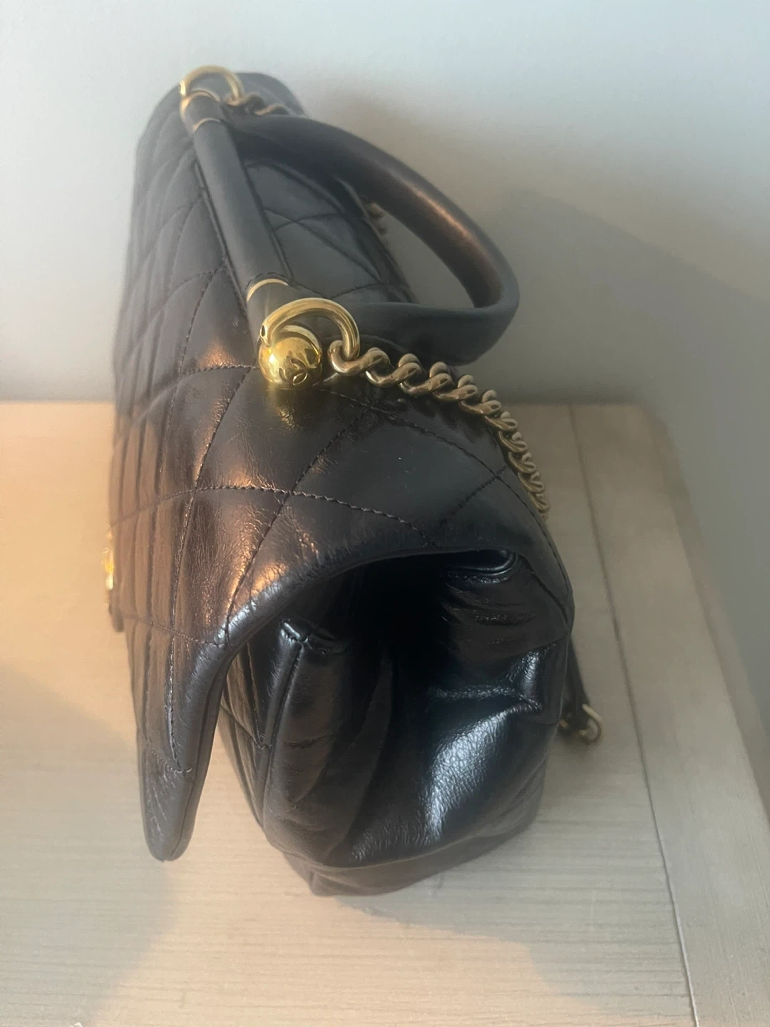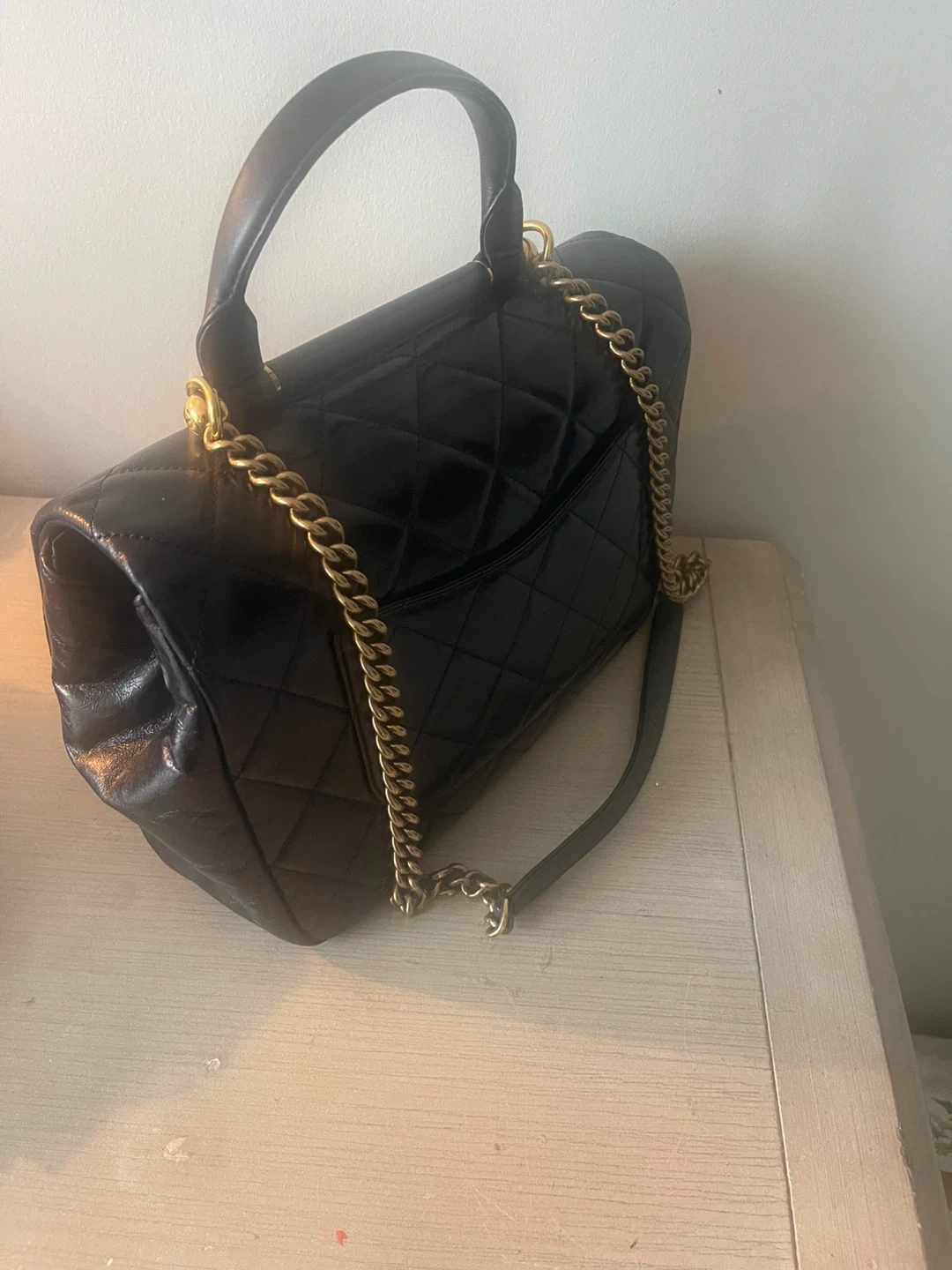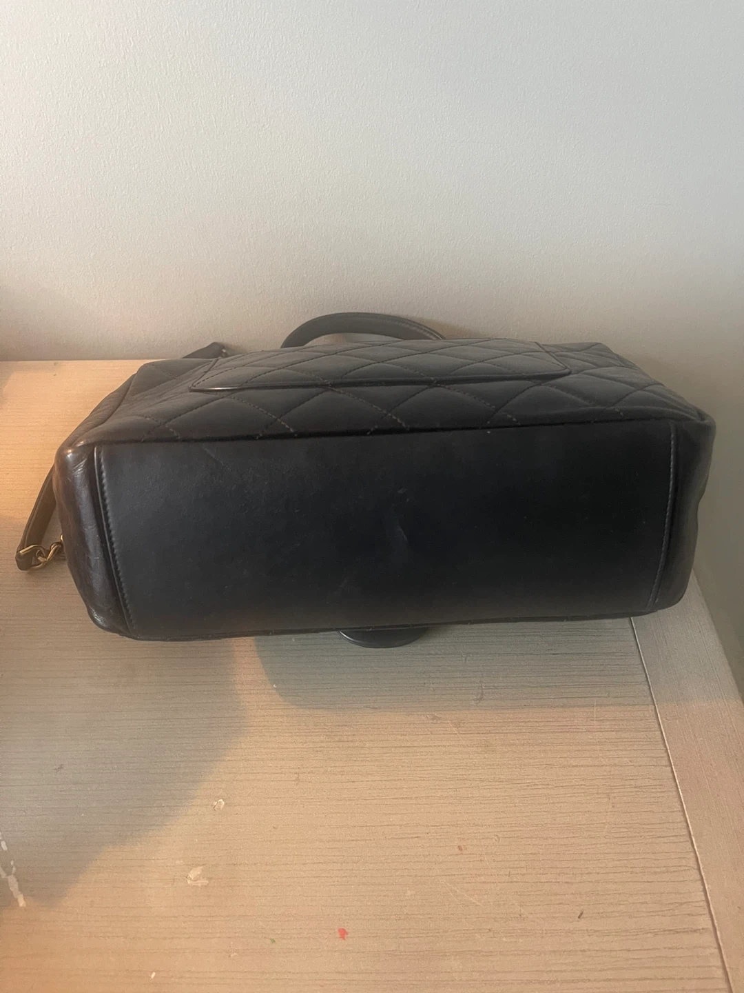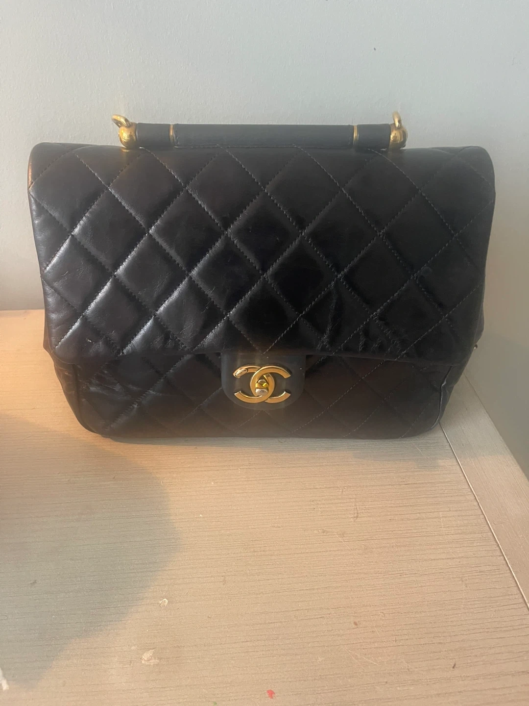 Selling a classic Chanel handbag in black quilted leather. It has the iconic Chanel logo and chain strap. It's in good condition and ready for a new owner!